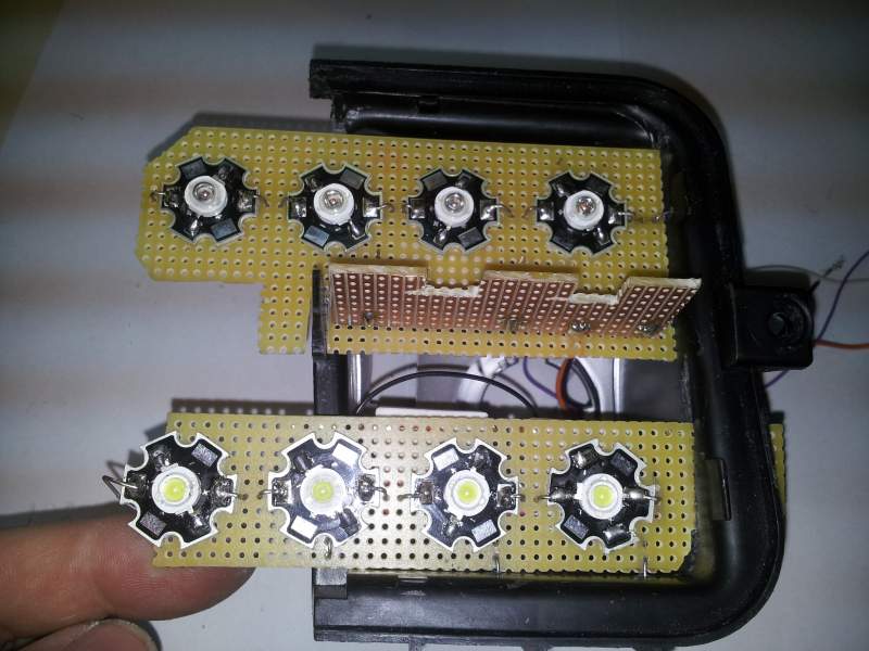 First of all I used four x 3 Watt white LEDs and put two each side. I used some resistors I had lying around (rather than buying some wirewound ones) I used 22 ohm resistors, six in parallel then another six in parallel to give a total resistance of about 8 ohms. They dissipate quite a bit of heat! I would suggest if anyone wants to build a similar circuit you just by a couple of power resistors instead