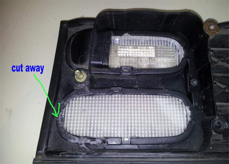 The one nearest the camera is the top/fog and you can see the leds sit right up to the lens as the board is clearly proud and just to secure I put just a few blobs of hot glue here and there, I did put some black tape around to stop bleed but I removed this to photo. This is the chamber that the black plastic needs removing, it will not fit under or in otherwise.