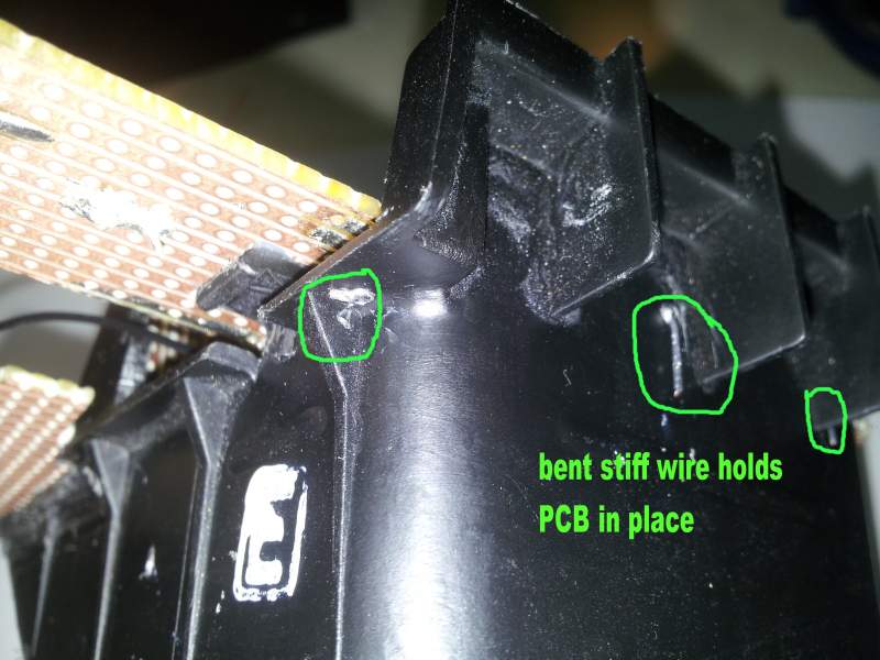 The pics tell the story well.... so here goes. The little bits of wire sticking out from each end of the veroboard are purely there to physically mount it in the reversing light enclosure