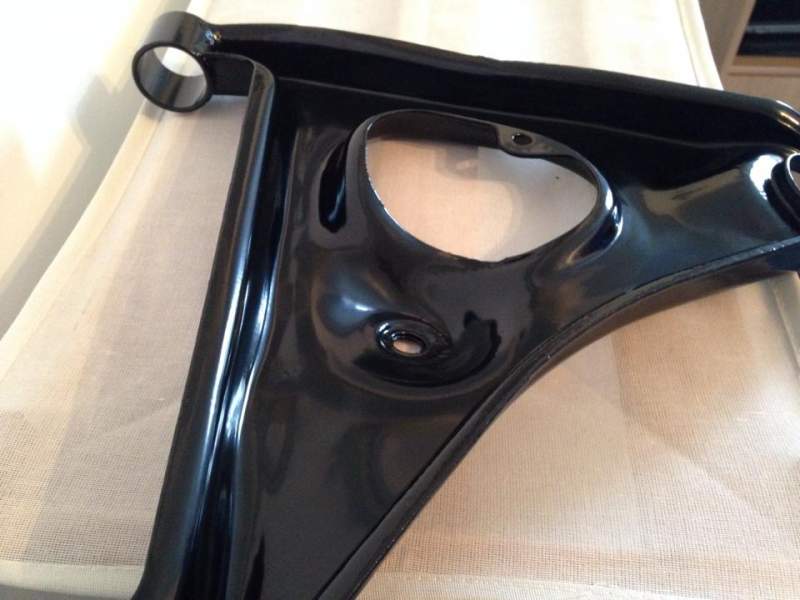 In addition, I also collected the first bits back from the powdercoaters. Finish is exceptional. It looks really shiny here, but it's satin and the same tone/finish as OEM parts. Once all the new bushings and joints are pressed in and the new plastic trim, it will look really good. New OEM bolts all round! All the rest to do next, including subframe.