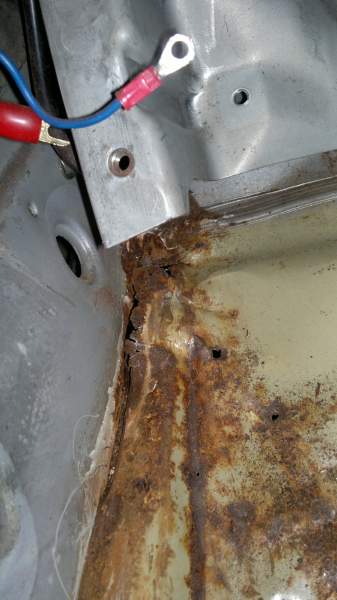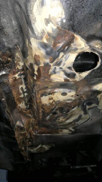 After cleaning most of the muck off I found 3 tears in the floor, 2 holes in the bottom of the sill where it meets the floorpan, the jacking point is half rusted away and the front corner where the floorpan meets the front bulkhead and sill has rotted away.....