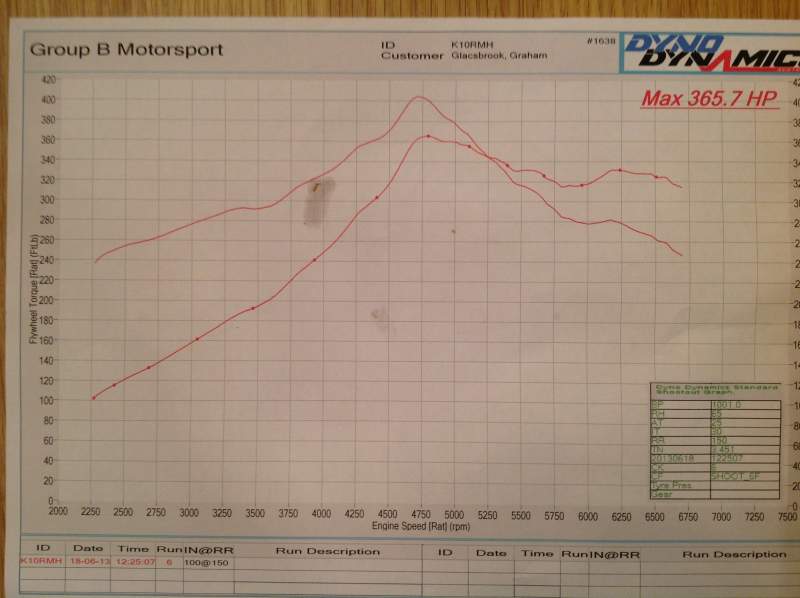 Put mine on dyno at GB motor sport to see what hp running, although the cars running like a old tram:-( uneven tick over back firing and coughing like an old dog,it still made 365.7 hp,told me if it was set up right with the new injectors that have been fitted should make good numbers,see print out apparently his has never seen a car ever running this lean:ohmy: well least I broke the record for something:)