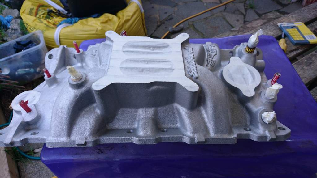 He just bought an edelbrock intake manifold and asked me if I could make it a little more interesting than the rough cast alloy that it was.. So here's the before and after..