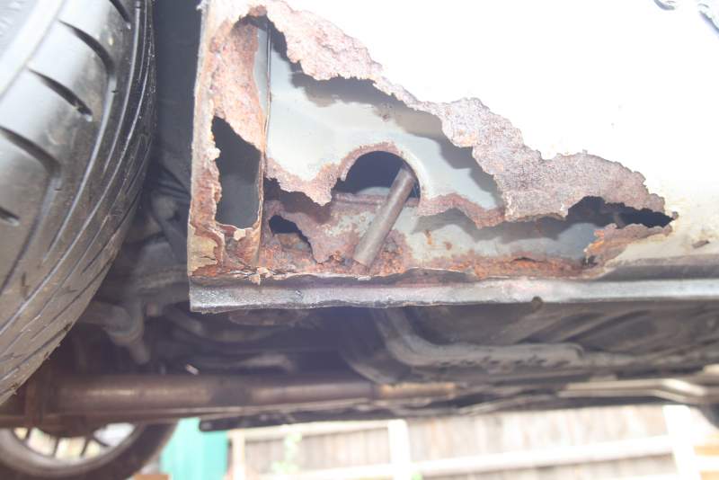 I removed the side skirt to get to the rotten O/S rear sill section..... made a large hole where the rust worms had been eating.....