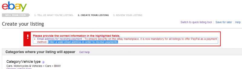 Trying to sell a car on ebay, When i get to the "continue" button it comes back with this error. Where am i supposed to put this email address, there is nowhere on the car form. Anyone got any ideas?, google doesn't seem helpful.
