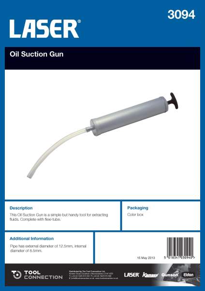 “This great product from laser is designed to make that annoying and frustrating task of filling (or removing) oil / fluids from hard to reach areas in engine bays, motorcycles and machinery a breeze. Cut down on mess and time by simply sucking oil from a container into the pump then using it to precisely fill things like gearboxes and diffs.”