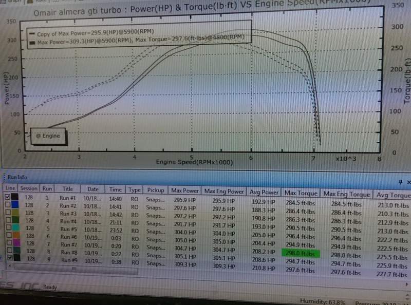 Not bad at stock actuator pressure of 0.55bar on a T28H. Completely maxed out the Almera MAF at 309bhp & 297lb·ft. Fun car, quite a handful for me on the dyno.