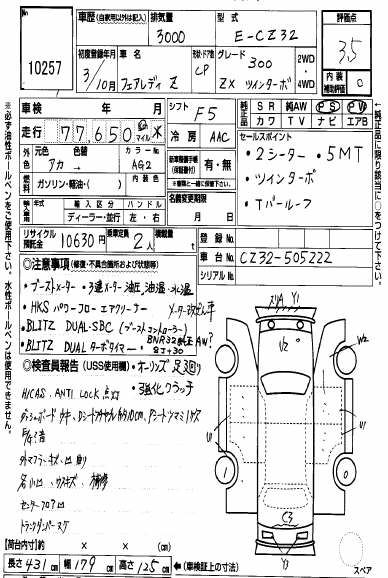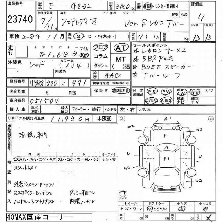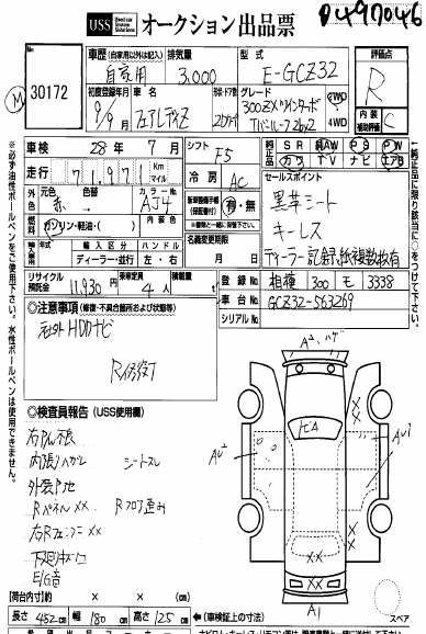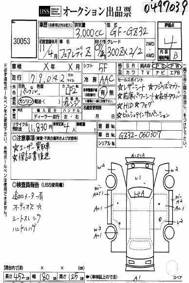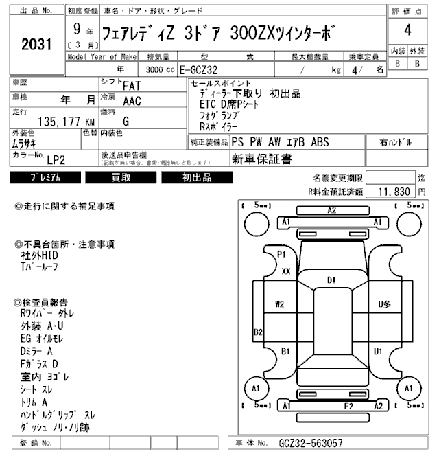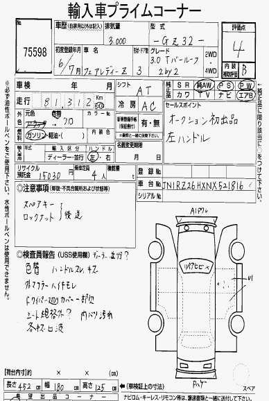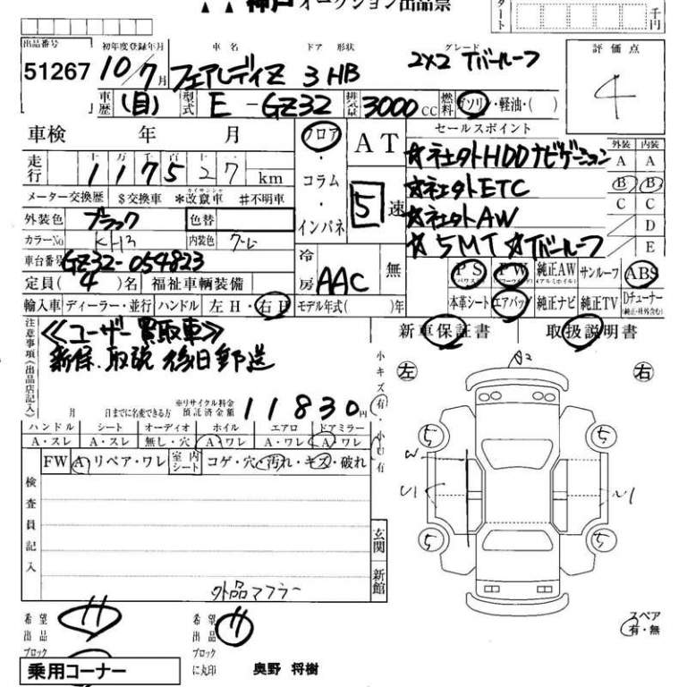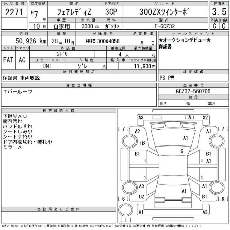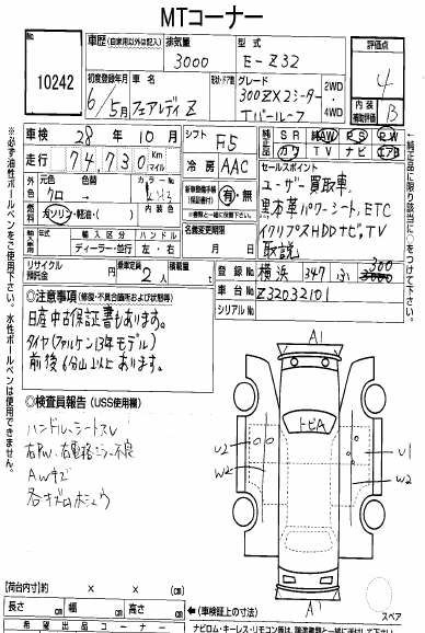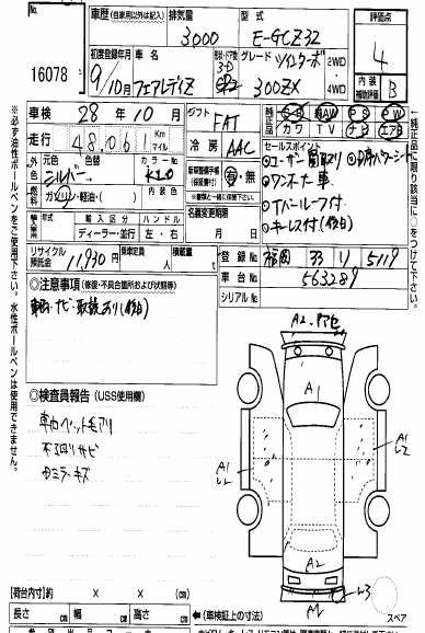 Interior C, first registered January 1994, 300ZX twin turbo 2-seater standard roof model, FAT, AAC, service book, power steering, power windows, leather, black leather seats, aftermarket 19 inch alloy wheels, aftermarket HDD navigation system, adjustable suspension, aftermarket muffler, seats and steering wheel worn and scratched, wheels scratched, door mirrors scratched, scratches and dents and repairs, bonnet and roof have stained paintwork, left front door and rear bumper have worn paintwork, other marks as per map