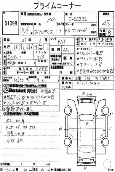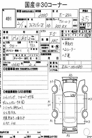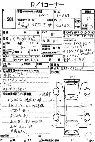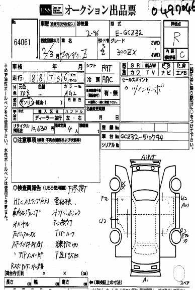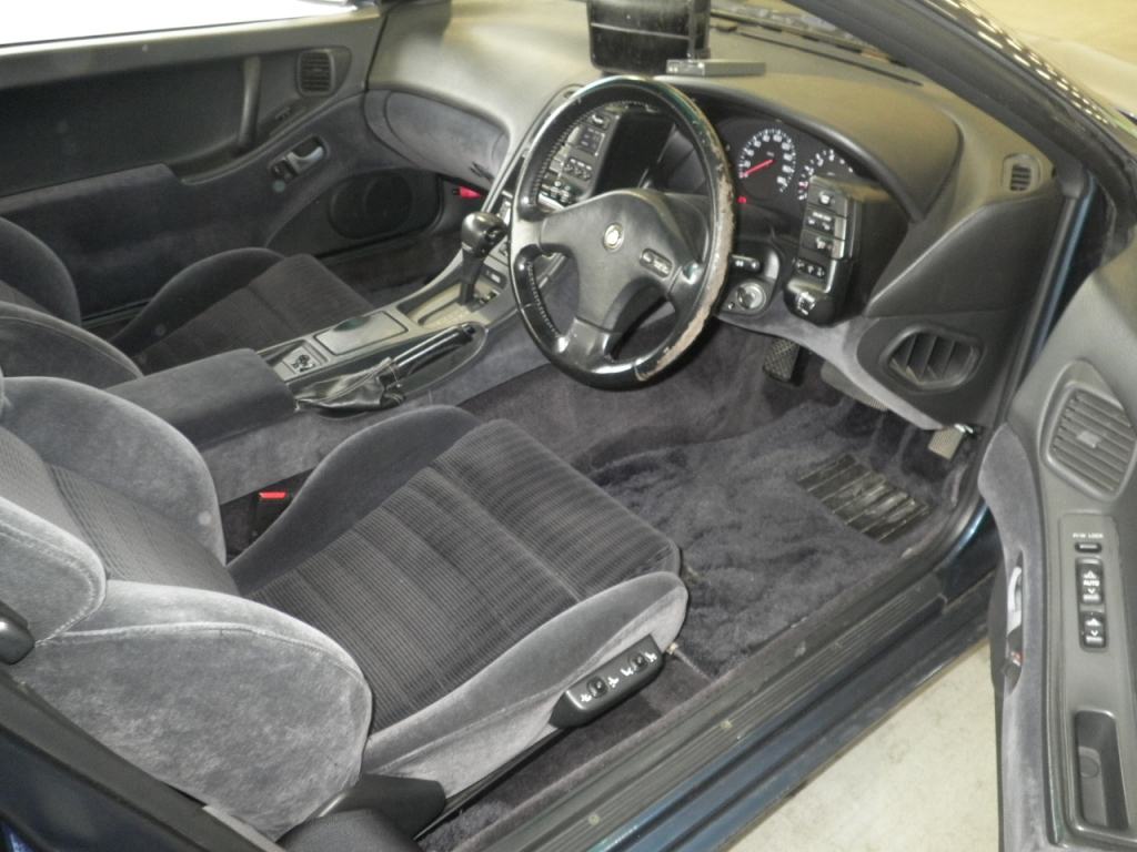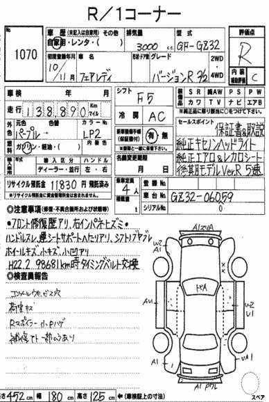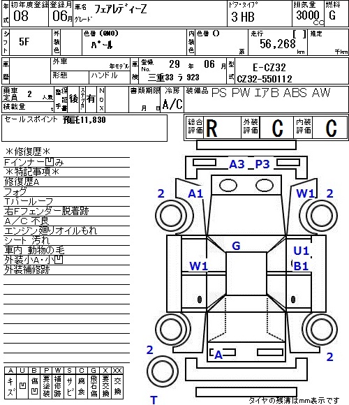 Grade R, interior C, exterior C, first registered June 1996, five-speed manual gearbox, power steering, power windows, airbag, ABS, alloy wheels, AC, front inner panels dented, repair history graded A, fog lamp, T-bar roof, right front fender has marks from be removed and put back again, AC does not work, engine area oil leak, seats have grime, animal hair inside vehicle, minor scratches and minor dents, exterior paintwork has repair marks, marks as per map