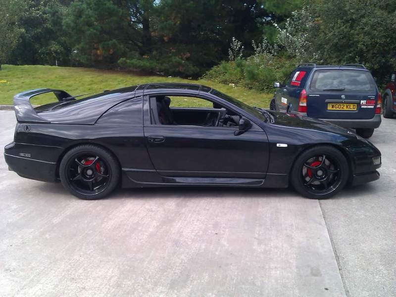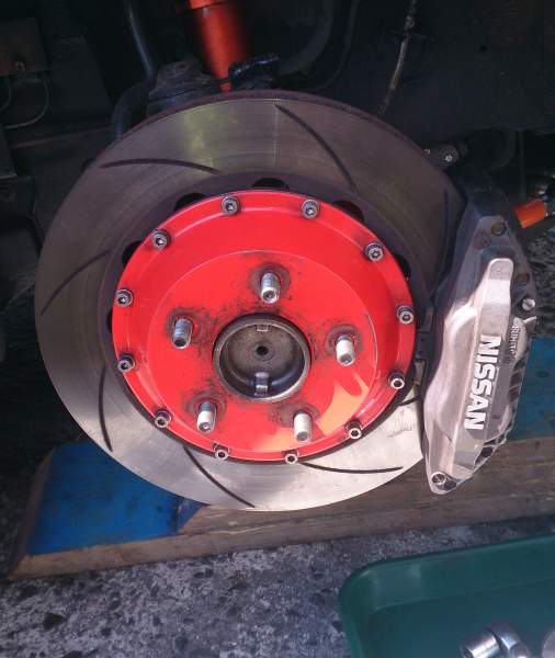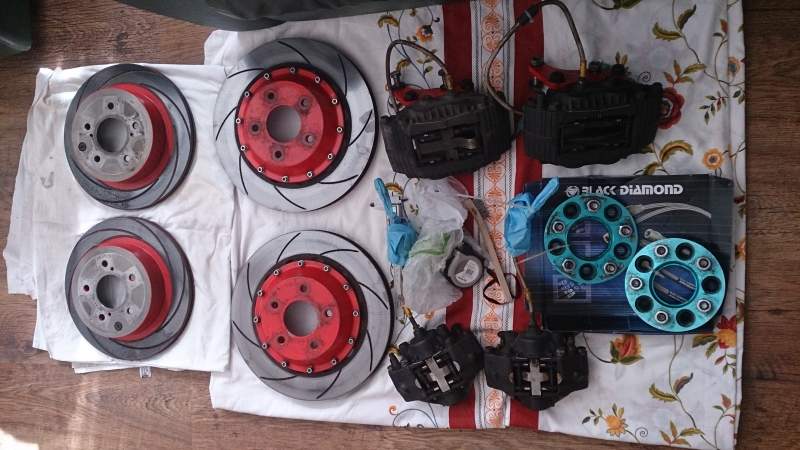 here we have a bigger brake setup which i had on my Z and i found it to be much better stopping than standard, the front is a floating rotor type 330mm disc (standard is 280mm) comes with the calipers off my import Z with goodridge stainless brake lines attached and the brackets with all the spacers nuts and bolts ect needed to direct fit.