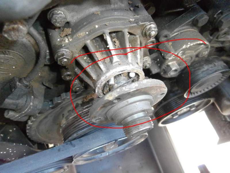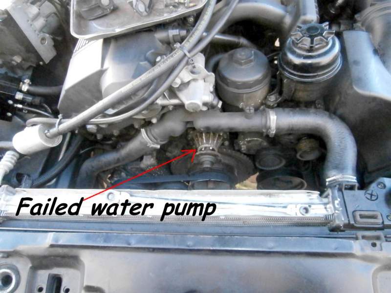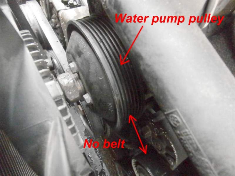Quick check around and soon found as suspected a missing drive belt, the one that ran the alternator and p/s pump, nice and easy..... but wait the belt was still there and intact but not on the pulleys?? why would a perfectly good belt come off with auto adjusters? soon found the water pump seized, well in a fashion.
