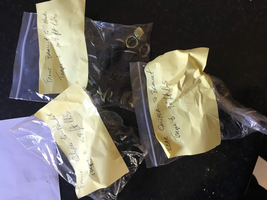 Fitted my brake brackets to the rear hubs in preparation for my freshly powdercoated calipers (not ready yet) and organised all the fittings into seperate labelled bags.