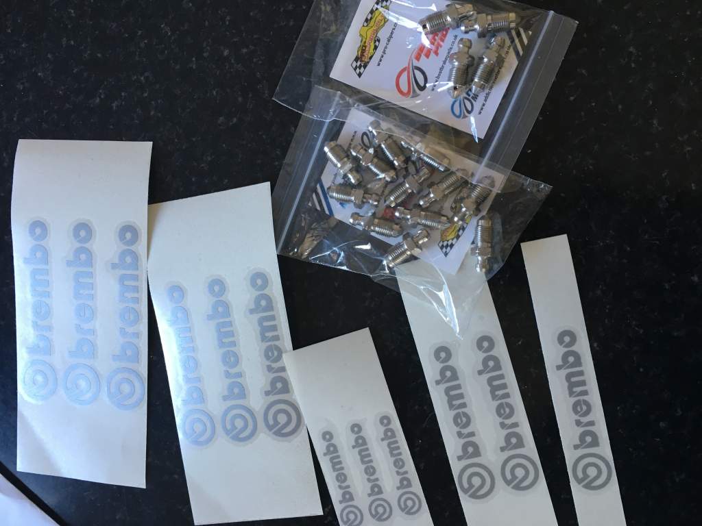 Another packet arrived containing the Brembo decals and stainless steel bleed valves for mine and another set of Evo calipers that are being done also:thumbup: