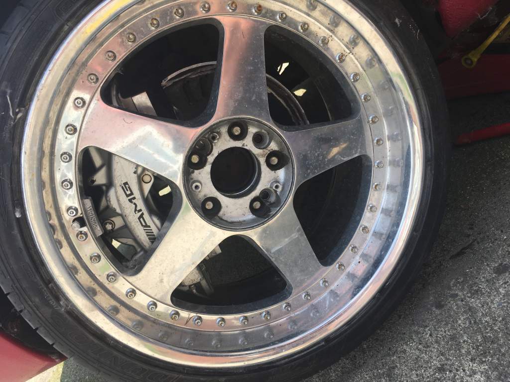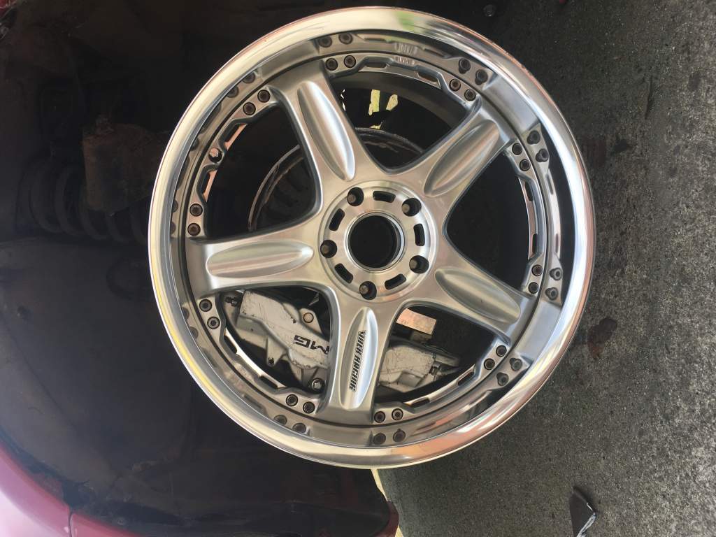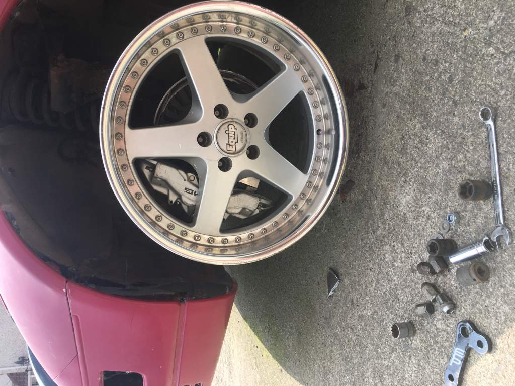 The “Good News” is that these 8 pot AMG’s fit inside an 18” wheel, the “Bad News” is that the spoke design on both my 19” Work Equips and my 18” Veilside Andrew’s means I’m going to have to push them out further than the 25mm spacers:thumbdown: