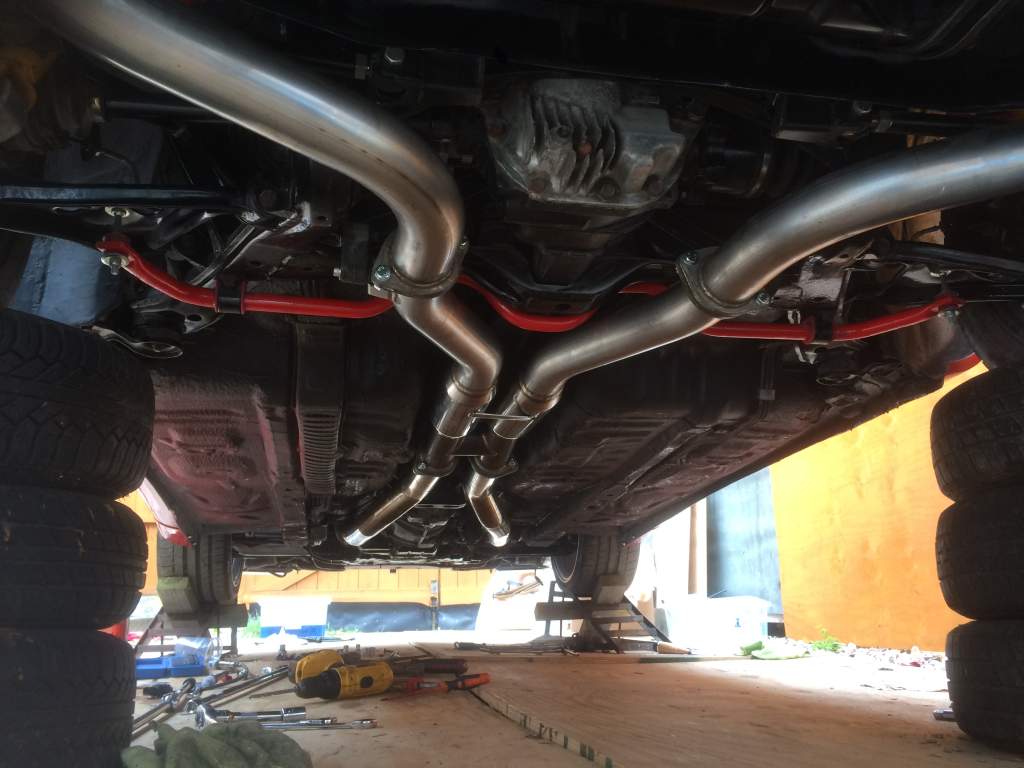 didnt get home till late today so didnt have much time just finished going over the system bolts the routed the cables form the air fuel ratio sensors into the cab i have a duel afr gauge so can monitor both banks of the engine just need to get them round the dash then its time to drop the car back on the ground and get on with the major brake upgrade also fitted the twin turbo decal lol the most easy job to date lololol