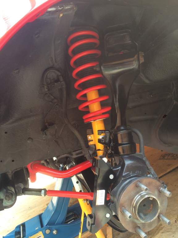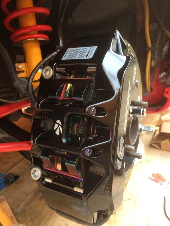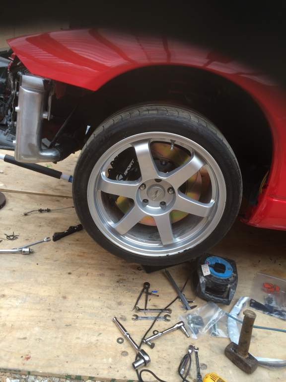 car back on the ground all work done on the under side made a start on the big brakes got the front on will get the rear on 2 moz bit of a fiddle but the fit it very good and fits behind wheel with no issues the front discs are 356 with 8 pot calliper have taken a side by side pic to show you just how much bigger vs stock ones you may notice the brand new wheels then powder coated got kurbed when i was moving it had no mirrors on at the time the wheels have not even be drive on there al going back in for a other full strip down and powder cost silver with a clear coat od silver sparkle bit of a pain but stuff happens i guess