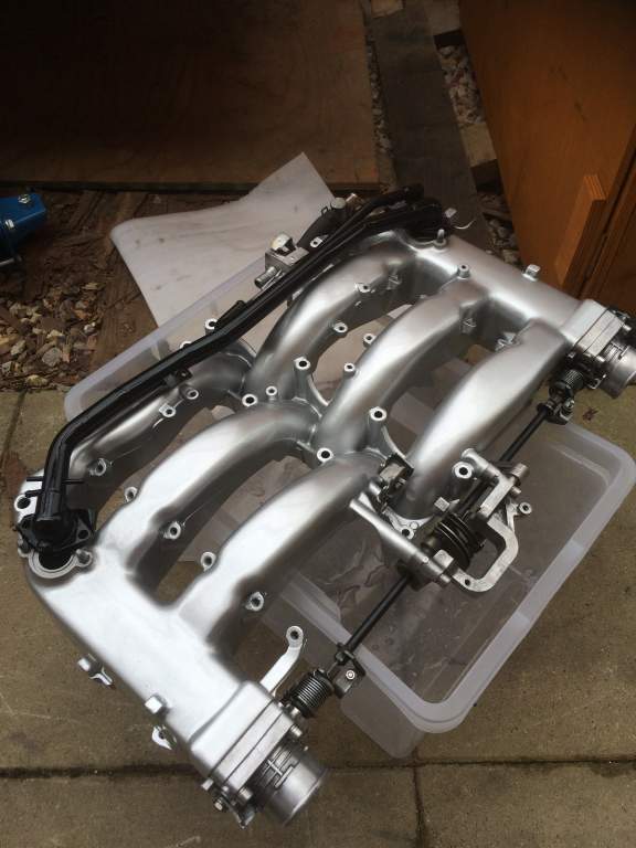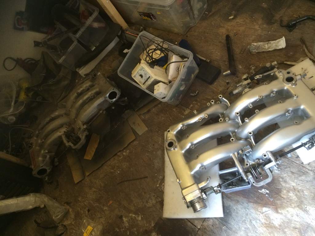 old manifold vs refurbed one balance bar painted manifold throttle pots back on all cleaned up with stainless bots, wheels back from the power coat after kirbing them when taking the car for paint