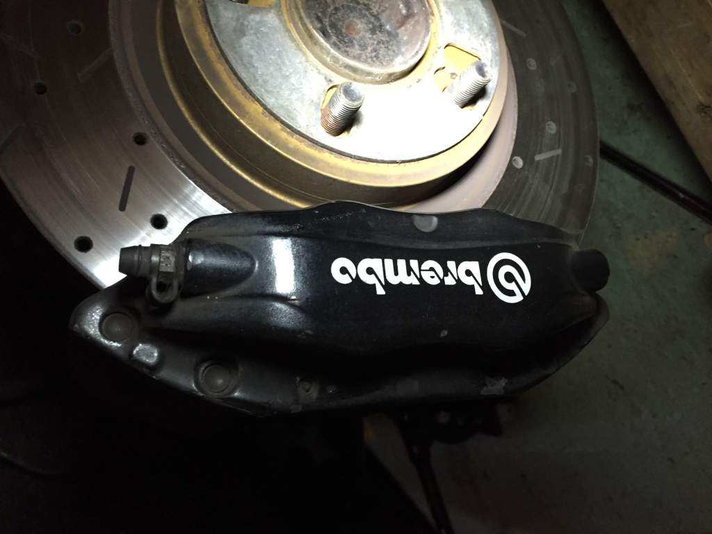 Brembo front calipers in black, disks are DBA drilled and grooved with hardly any wear on them. I do not know what pads are in the calipers as they were in there when I bought the car, but you can see from the photo there is plenty of material left on them.