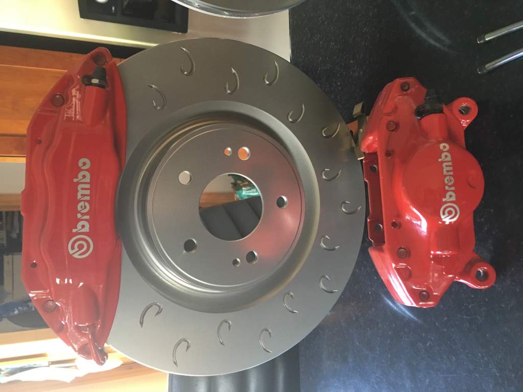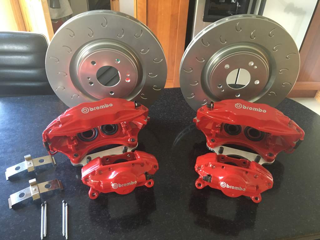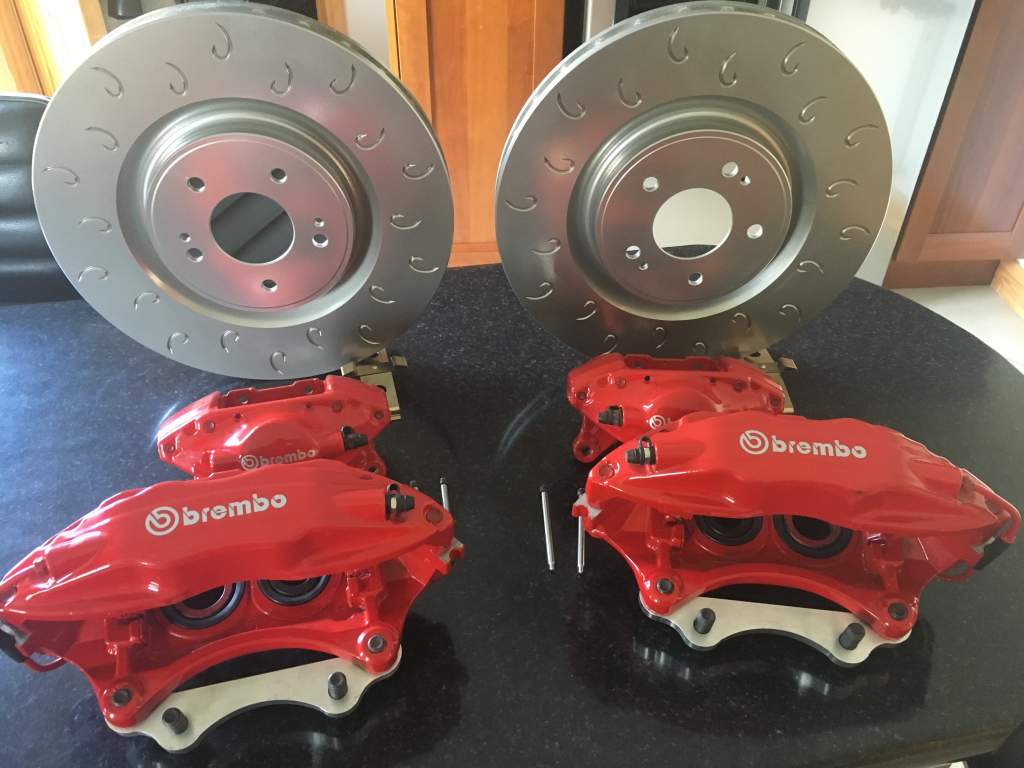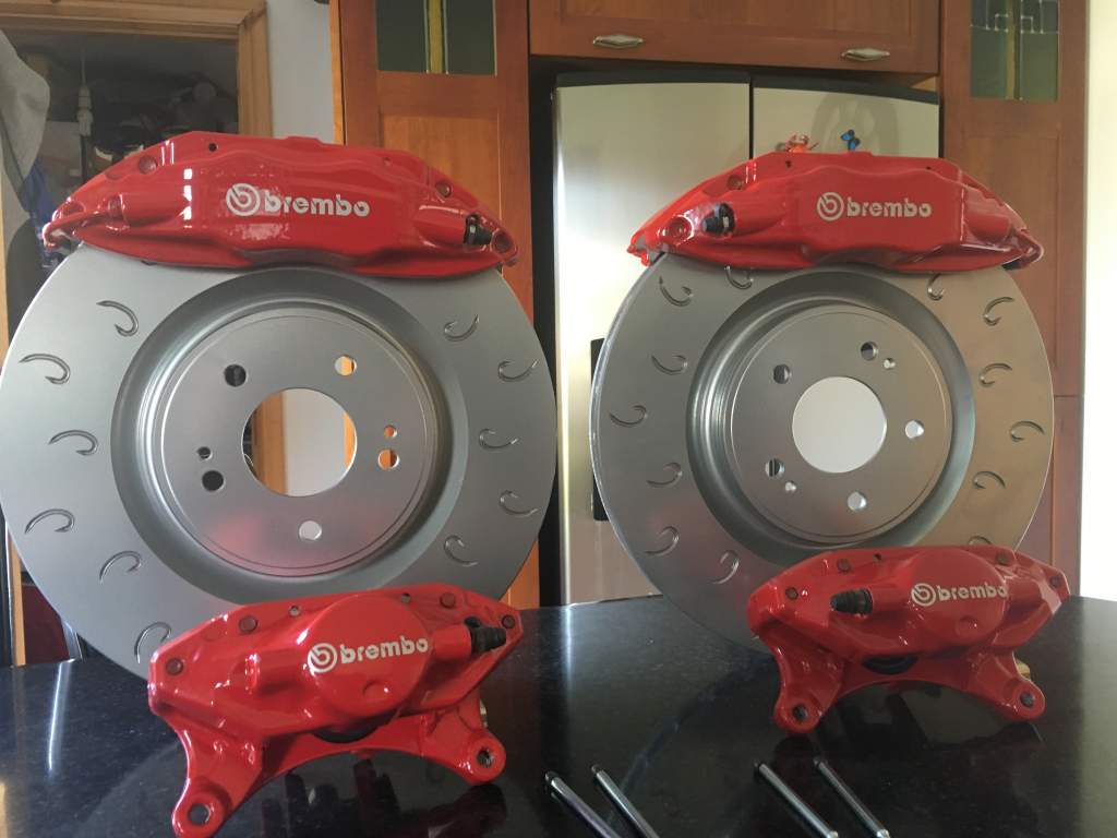 Right guys, as I've changed direction on my brake system, I have for sale, my full set of newly refurbished Evo Brembo calipers (Front & Rear) with new in the box pads and Evo X 350mm C-Hook discs (Fronts only). Calipers have new seals and dust covers (Front & Rear) and the fronts have new stainless bleed nipples also. The kit comes with the front brackets but I haven't got the rears.