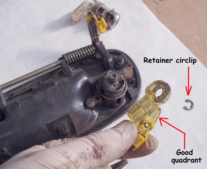 When working with the drivers side window yesterday I must of broke or dislodged something as today my drivers side door wont lock with the key or the remote! Took the door panel of and yes the yellow plastic quadrant is broke. So it looks like I will be locking the door from the passenger side till its fixed.