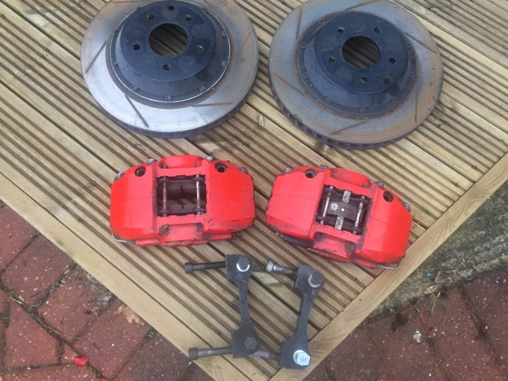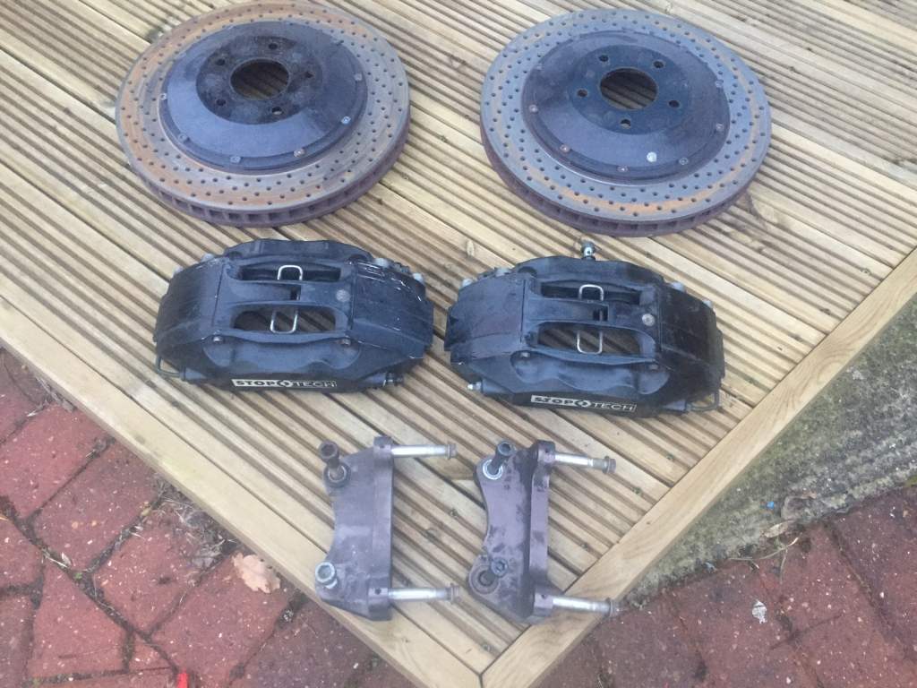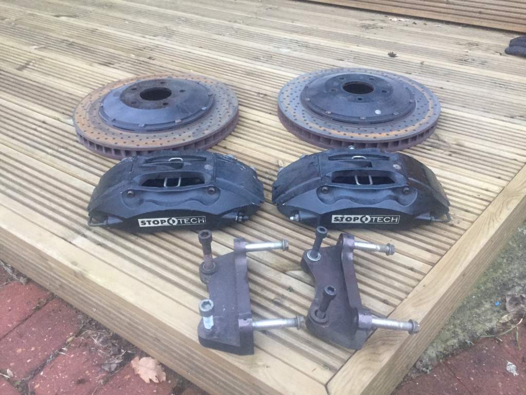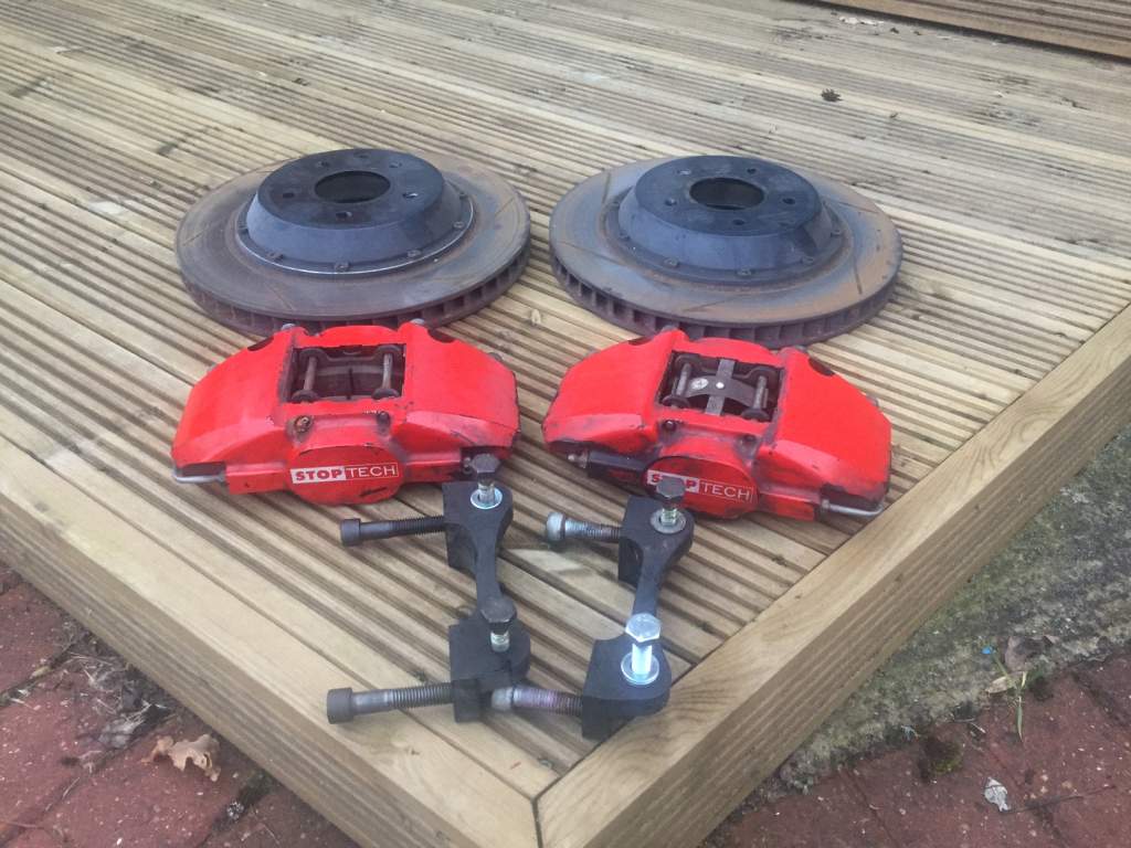 This is the Stoptech ST-40 355/32 front and ST-20 328/28 rear. The entire kit is in very good condition and while the kit has seen fairly hard use it hasn't had a difficult or prolonged life.