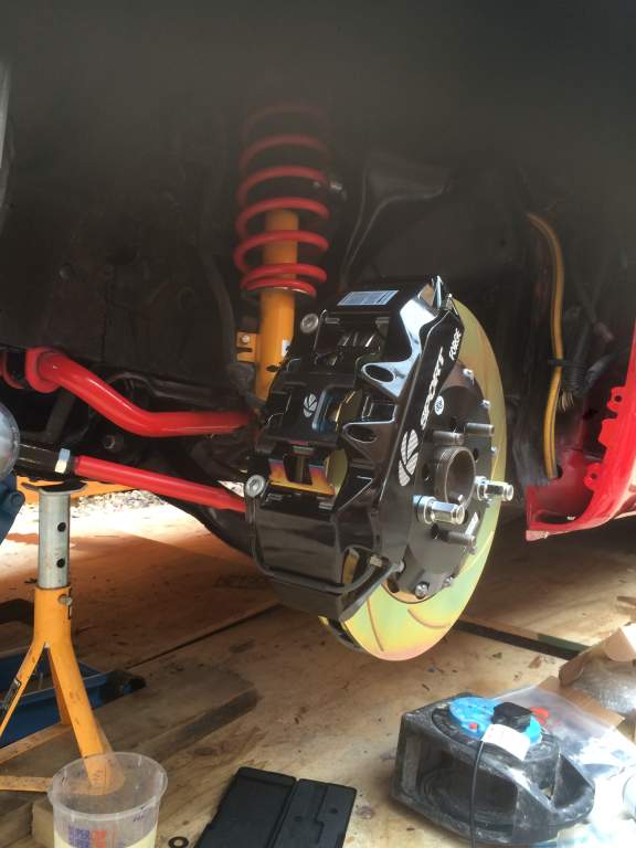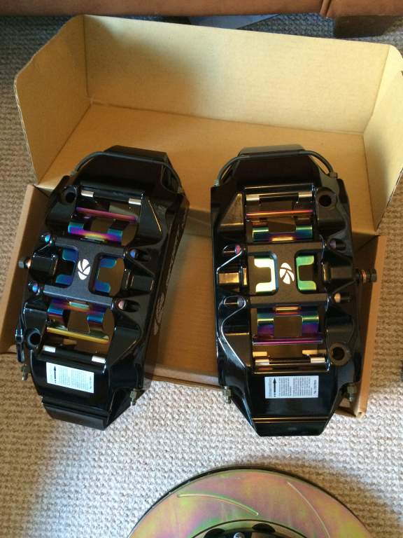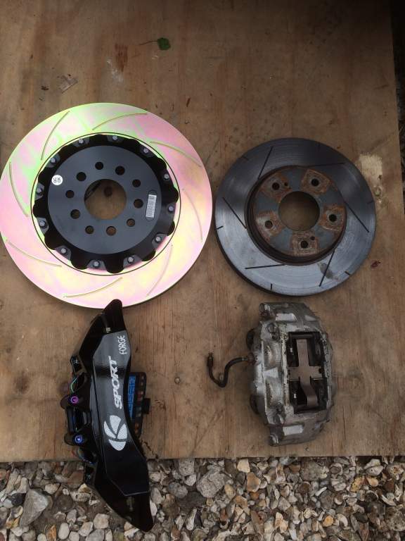 front are 8 pot 356mm discs rear are 4 pot 330 mill discs after the insurance man has been the new k sport brakes are coming off you will get front and rear kit inc all 4 discs pads and braided lines then brakes have done less than 100miles so not even bedded in ,i get them brand new look at my build thread to see i will take £1600 for them front and rear i payed £ 1200 just for the front tota and £1100 for the rear l utter bargain will need to be picked up really but can cross that bridge when we get to it all i can say it i have this is a 100% must for anyone with uprated power the brake are mega infact i would say there the best brakes i have ever felt there was no way i would have been or had may car with out them the best mod you will ever do to your car