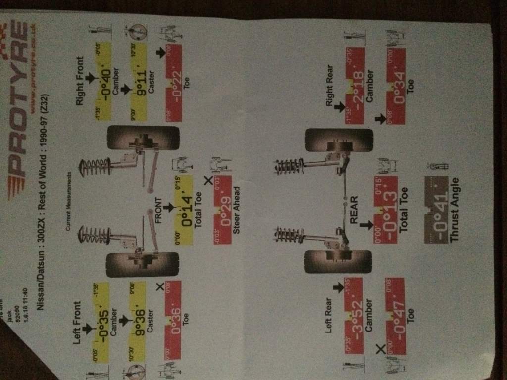 Found the previous alignment sheet; the rear is worthless information and it’s a for a Z31 (won’t make that mistake again) but it shows the front camber was 0.2, I’ve raised the front 5mm or so in anticipation that it drop a little with a degree of camber extra.