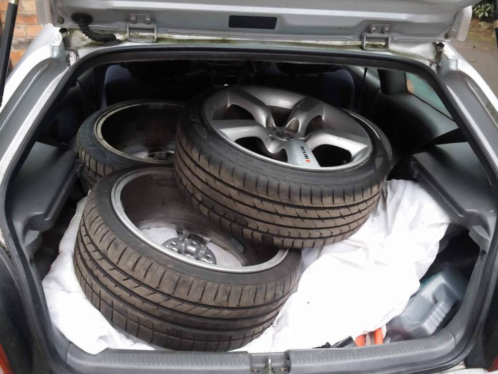 Purchased a set of 350Z anniversary wheels today, courtesy of a mate in Birmingham. Once we figure out how to get them back, I'll get them refurbished and fit some red Z badges for center caps. Possibly replace the tyres if their grip is shite.