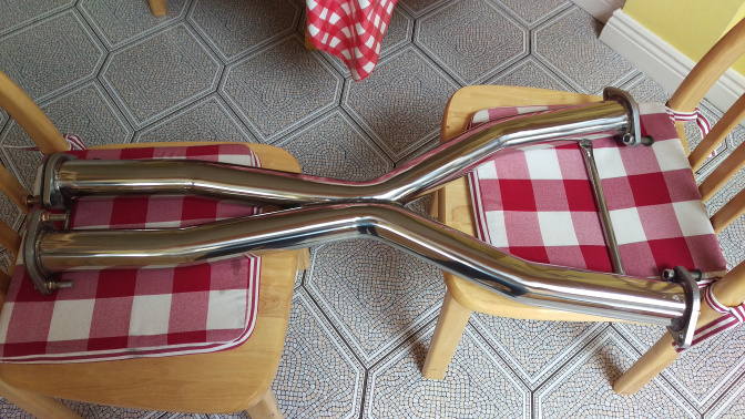 Since a spanner is stuck on top of the cats, we decided to finally fit the Japspeed X-Pipe to match the back boxes. Polished these up and also gave the cat undertrays a quick clean and paint. I've just picked up some new exhaust bolts (only available in packs of ten - cost me €60!) so this can be finished possibly tonight.