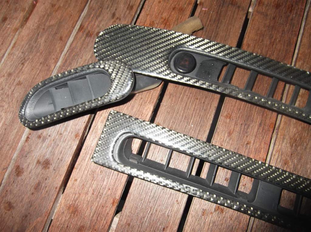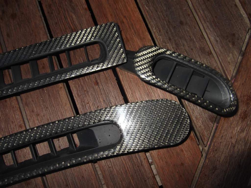 Set of four dash vents. These have got a proper carbon fibre overlay bonded to them, not thin hydrodip tat.