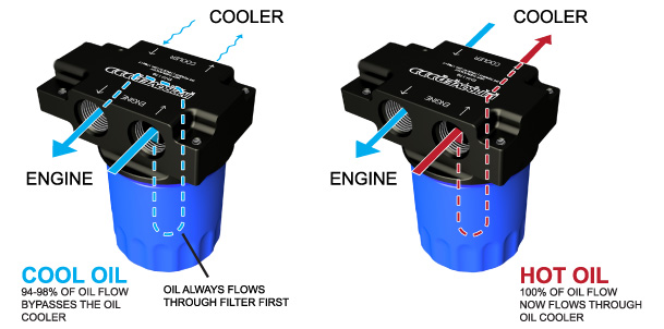 While the engine warms up, oil is passed through the filter and returned back to the engine bypassing the oil cooler. Once up to 185F, the thermostat directs all the oil through the filter and to the oil cooler. From the cooler, back to the IR filter head and back to the engine.