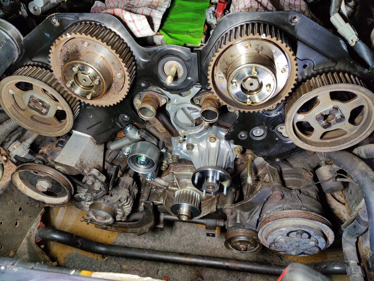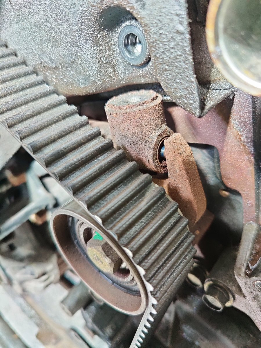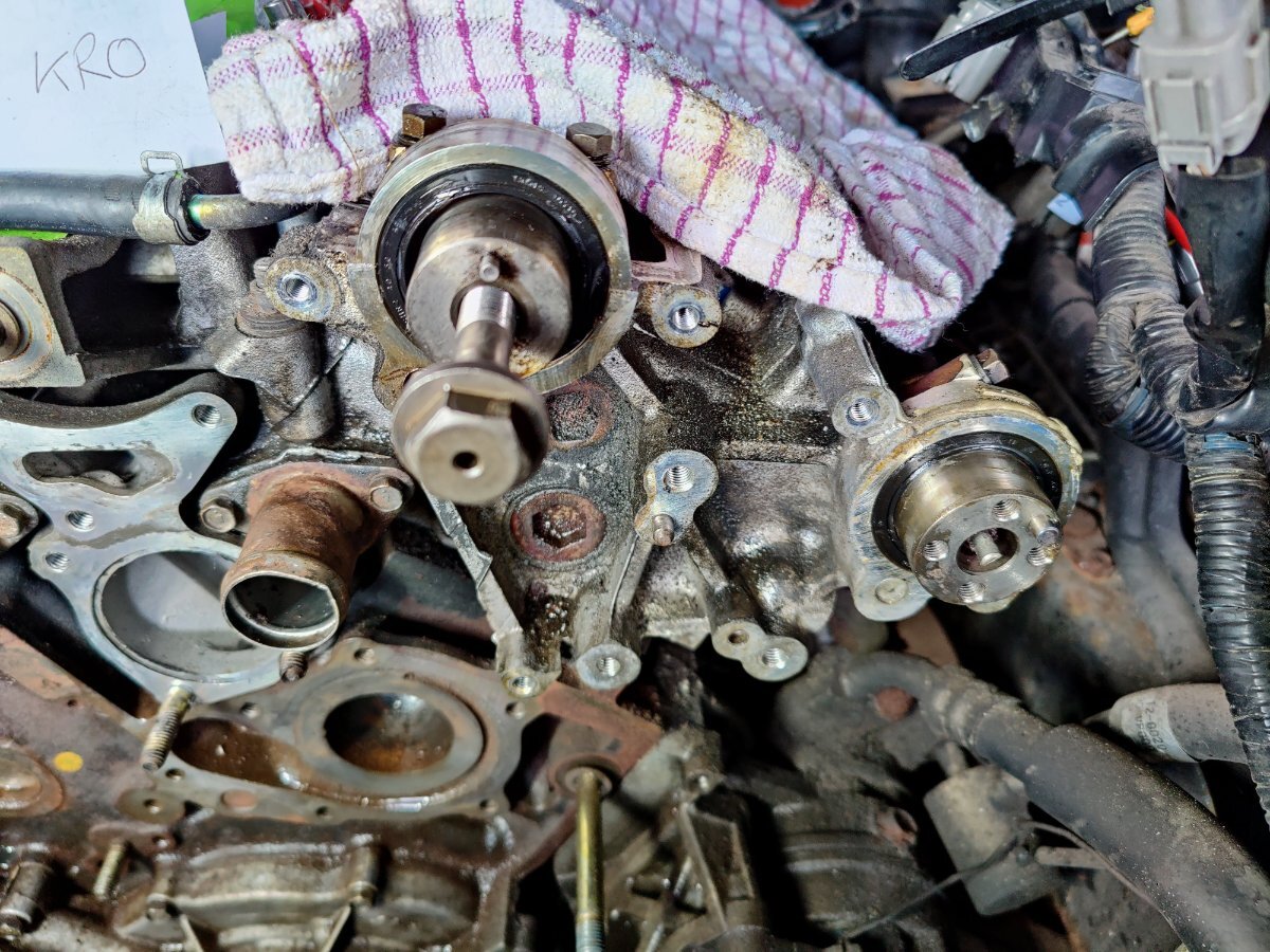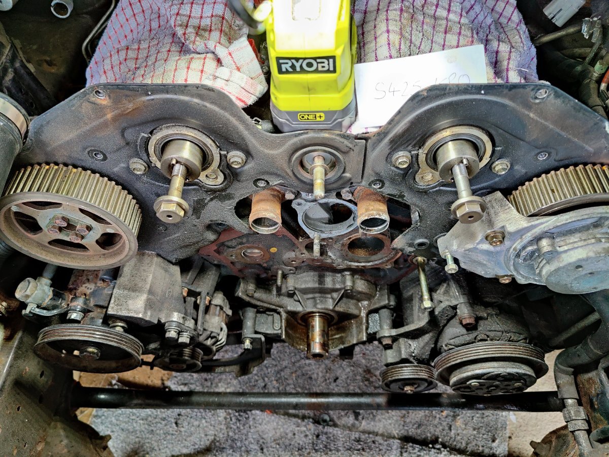 4 X cam and 1 x crank seals removed and replaced with new. New crank sprocket on. Cam gears fitted and torqued. New idler studs on. New water pump fitted. Tensioner correctly gapped at 4mm and loosely fitted.