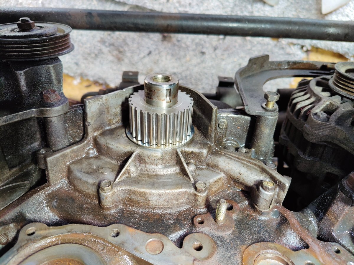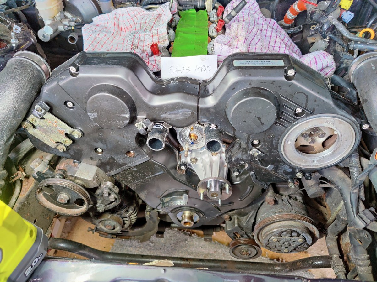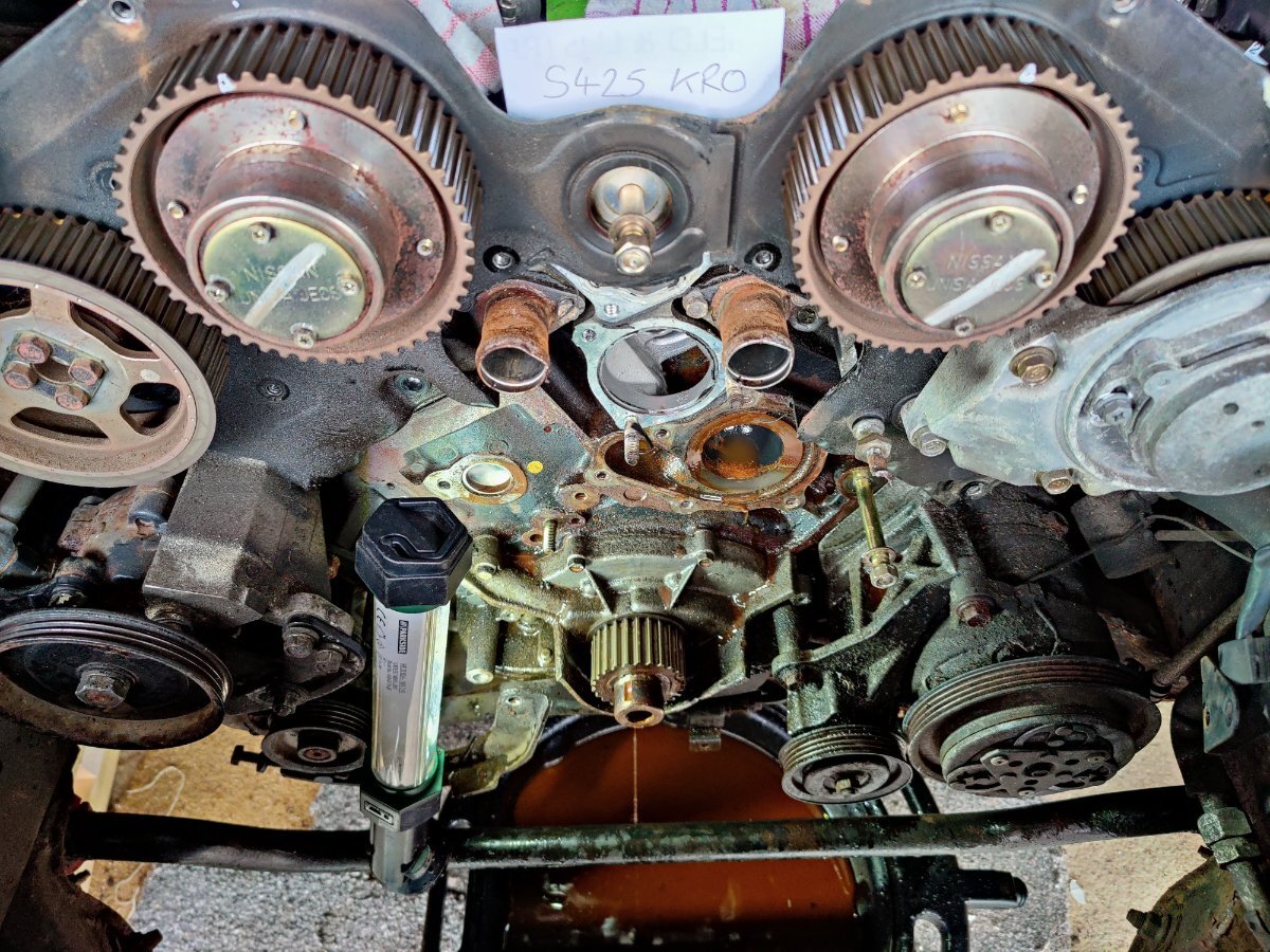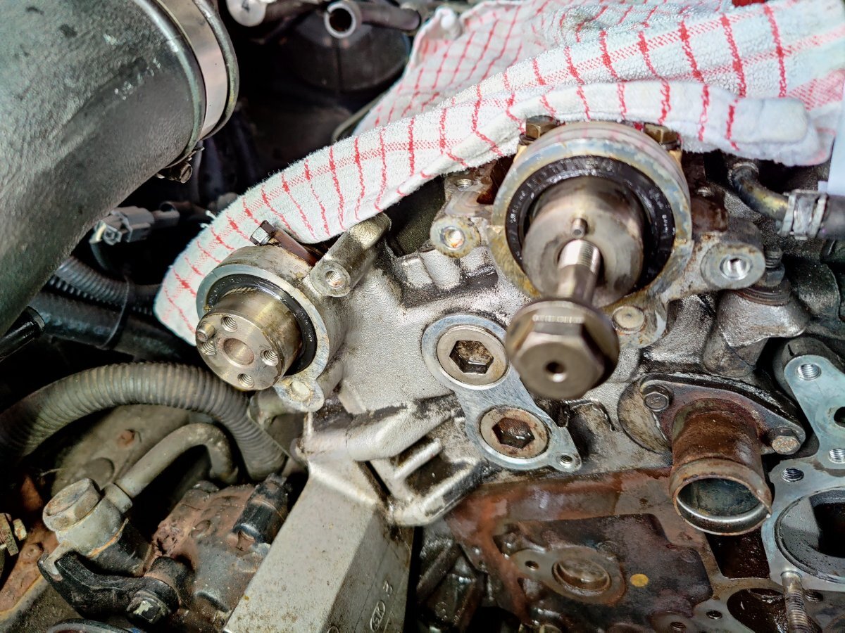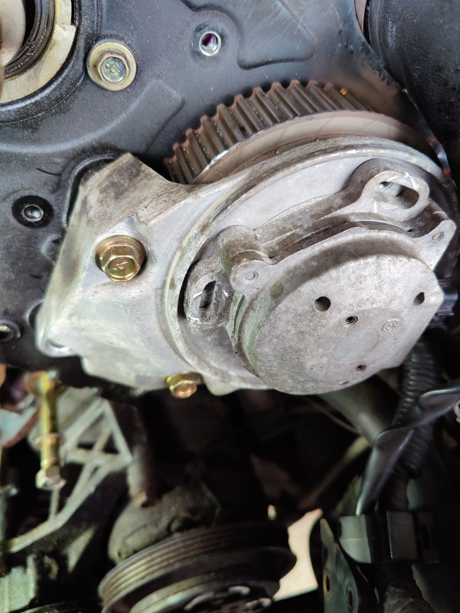 4 X cam and 1 x crank seals removed and replaced with new. New crank sprocket on. Cam gears fitted and torqued. New idler studs on. New water pump fitted. Tensioner correctly gapped at 4mm and loosely fitted.
