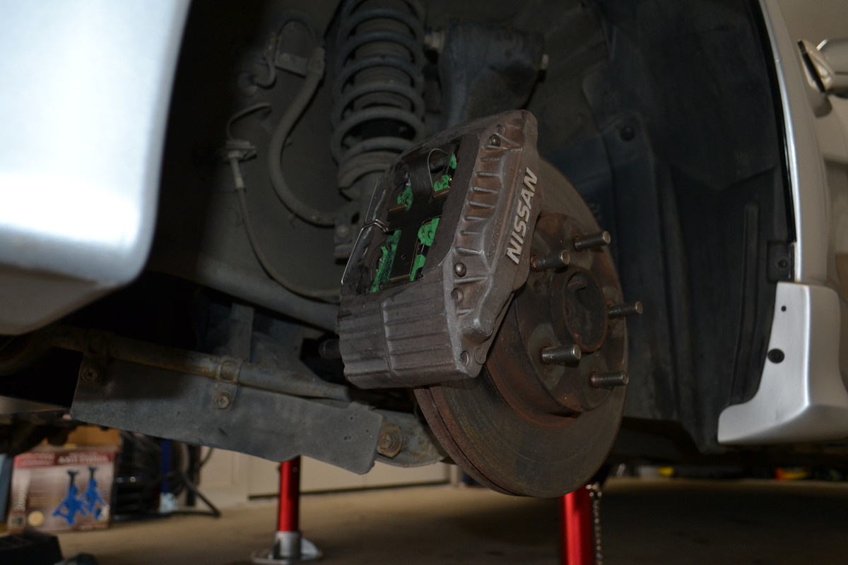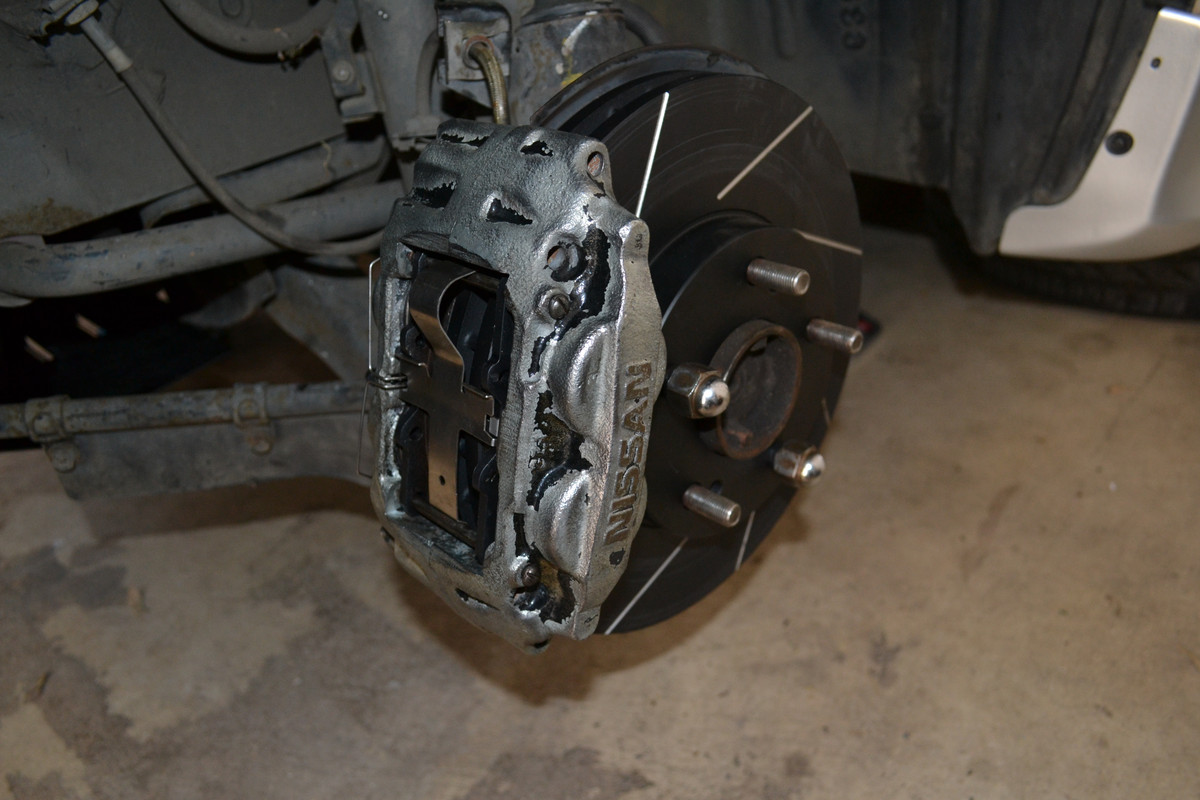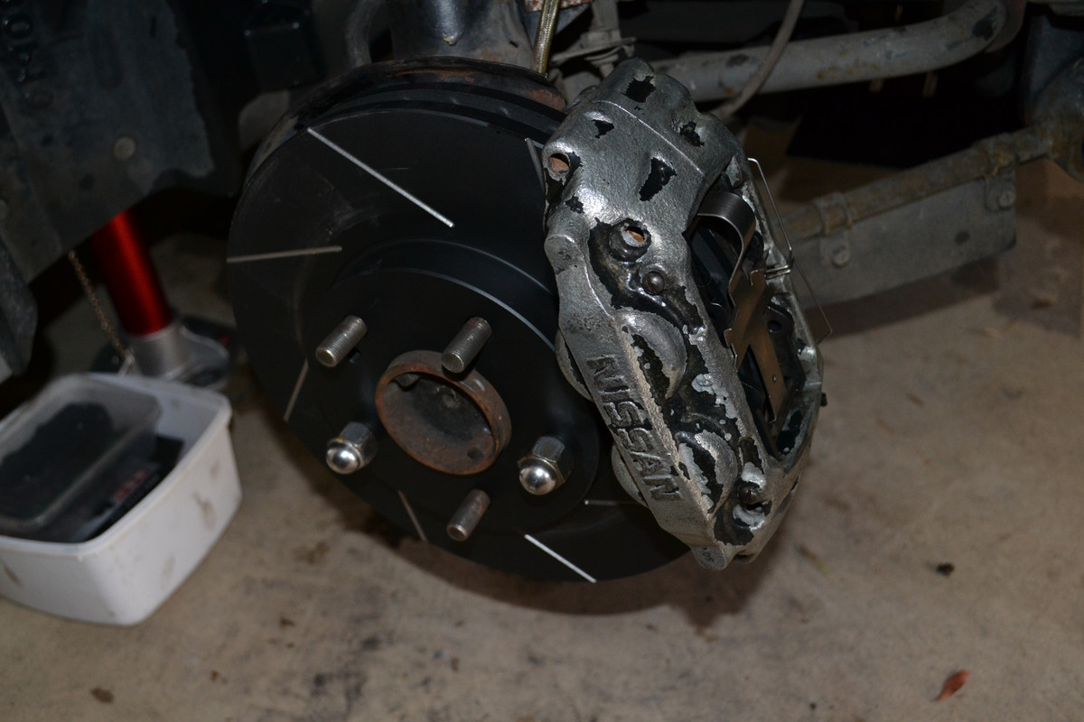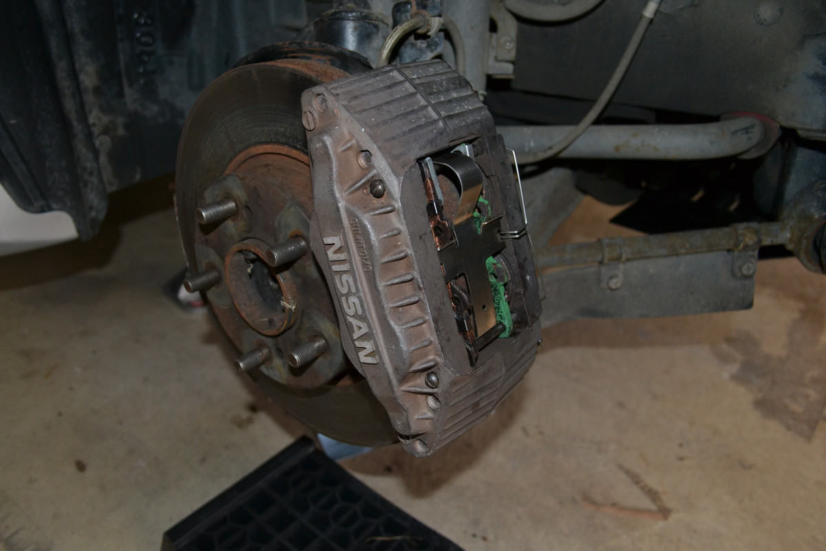 The first step is removing the hydraulic pistons from each caliper. The 300ZX front calipers use a quad-piston design — two pistons in the outer half and two in the inner half.
