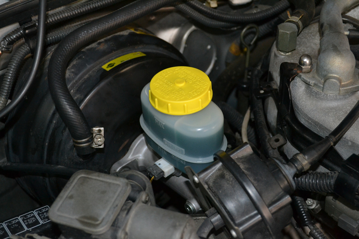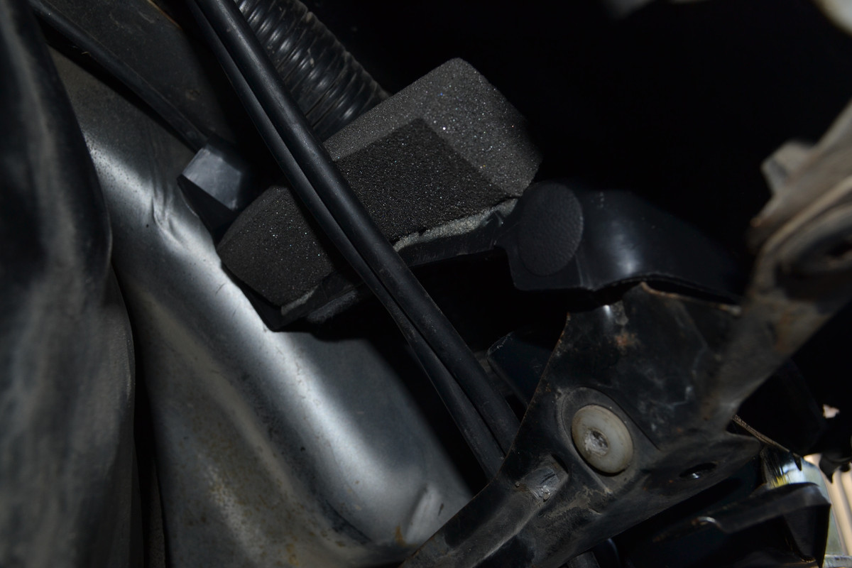 For the air supply, I used an old brake hardline which has a partially cut rubber OEM brake hose still crimped to it as the perfect adaptor tool for attaching my blow gun nozzle and feeding compressed air into the caliper’s brake hose port.