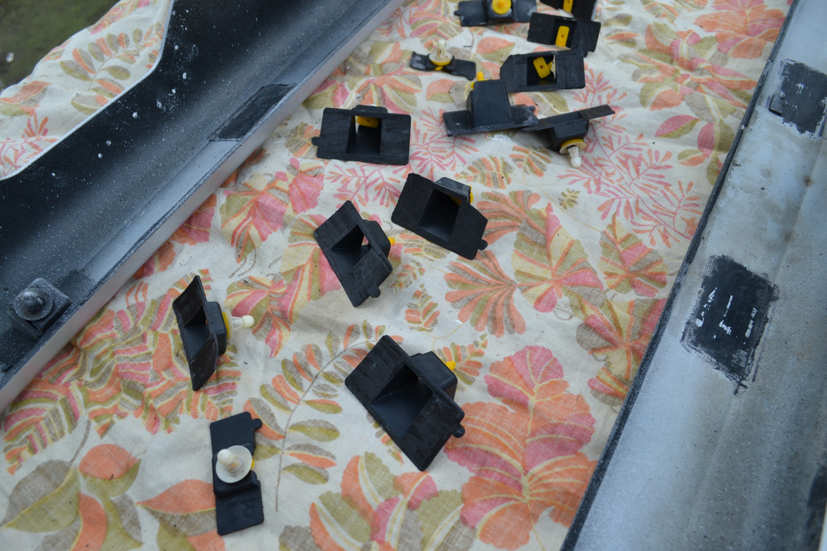 So the first step in the restoration process for the skirts was to remove both of the side skirts off of my car and though my dad managed to do that in 2022 the removal process caused more then half of the side skirts 24 factory mounting tabs to pop off and so an extra step of re-bonded all of the popped off mounting tabs would need to be done after the skirts had been repainted.