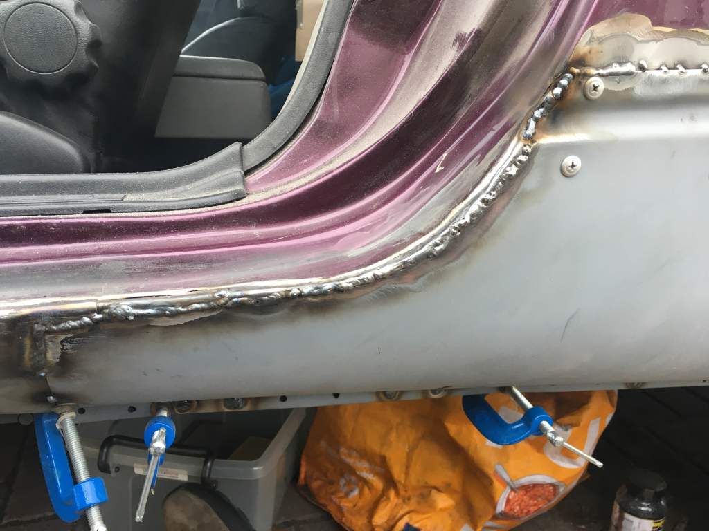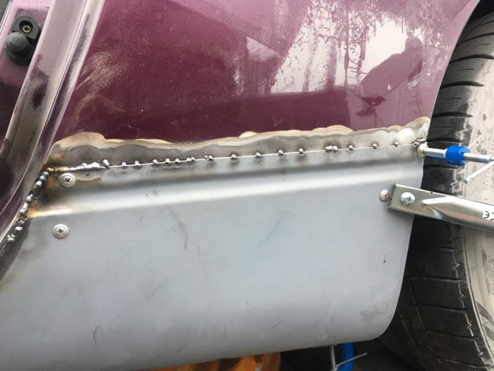 Saturday gave me 2 hours to get some welding done.... so I welded the outer rear sill panel in place... I played join the dots to keep the heat out of any one area to minimise distortion as much as possible. I ran out of time to grind the welds back, so I sealed it all with some 99% zinc cold galvanising spray to protect it all, till I can get to grind it back another day. It will need some bodywork done to sort out the dents hidden with thick filler that I have uncovered doing this. Going to lead load it rather than filler it. We will see how this plan goes.... I now need to fabricate a small section in front of the new section to close it up fully. I also need to remove passenger seat and carpet to repair the chassis rail section.... all fabricated, but need to move fuel lines and all other flammable items first.... Getting there now....