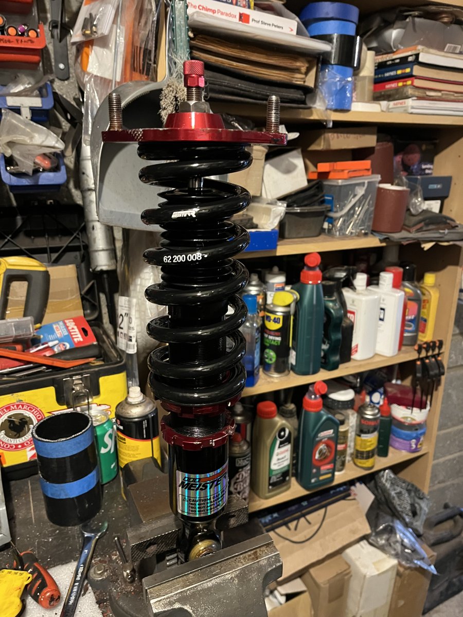 Refurbed the front Coilovers today. After many years they were looking a bit tatty although still functioning well. New springs, top pillowballs freed up and relubed, and given a good clean. Before and after photos -