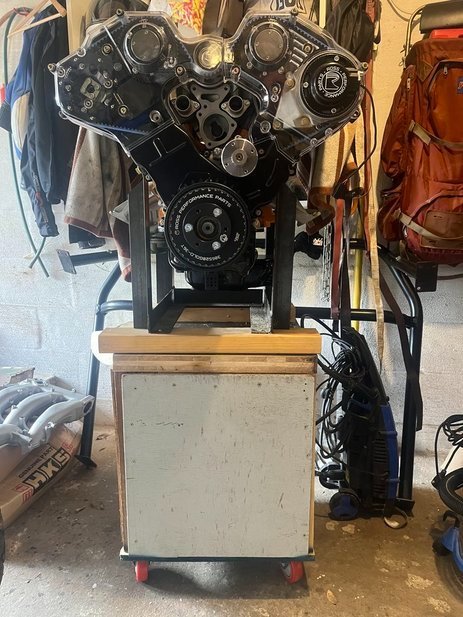 Engine is home now, just need to add the fuel rails, new injectors, upper plenum, throttle bodies, and then the belts, alternator, etc... Everything should be good to go once the body comes back from paint. Will compile a full build sheet soon. Here's a pic of the motor on my new rolling stand whipped up from spare lumber I had left over from various projects.