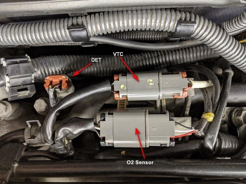 The detonation sensor circuit is the left hand connector in the picture below (white and black wires main harness side). The VTC connector (yellow dots on plug with green/black and black/red wires main harness side). The O2 Sensor connector is at the bottom (Black, White and Black/Red wires main harness side).- Targa straps + bags