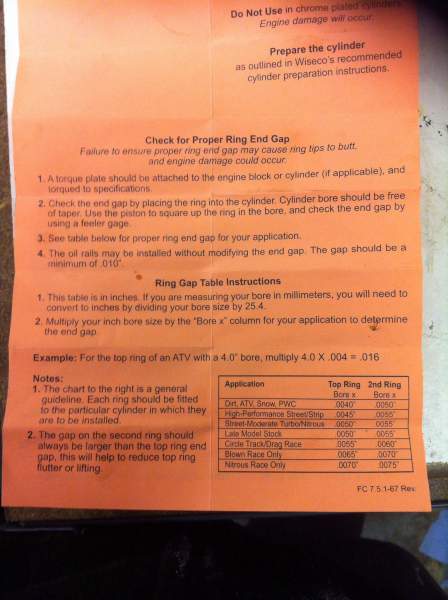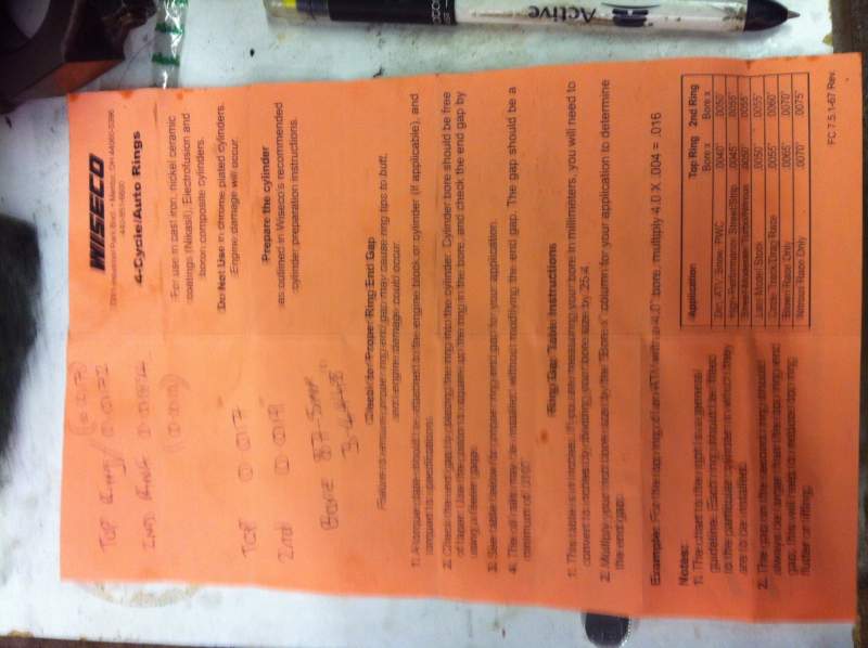 I have 87.5 mm wiseco pistons I just wànt to double check my calculations for ring gap Wiseco spec for street moderate turbo/nitrous is as follows Top ring calc 0.005 2nd ring calc 0.0055 Now take bore size x ring calc For top ring bore is 87.5/25.4 to give fig in inches So 3.44488x 0.005= 0.0172" 2nd ring 3.44488x0.0055=0.0189" So top ring end gap 0.017 2nd ring gap 0.019 Does that seem right? Checked the top ring with out any filing and it's 0.009" so I have to file 8 thou off to get 0.017"