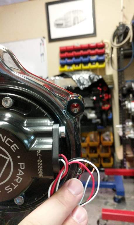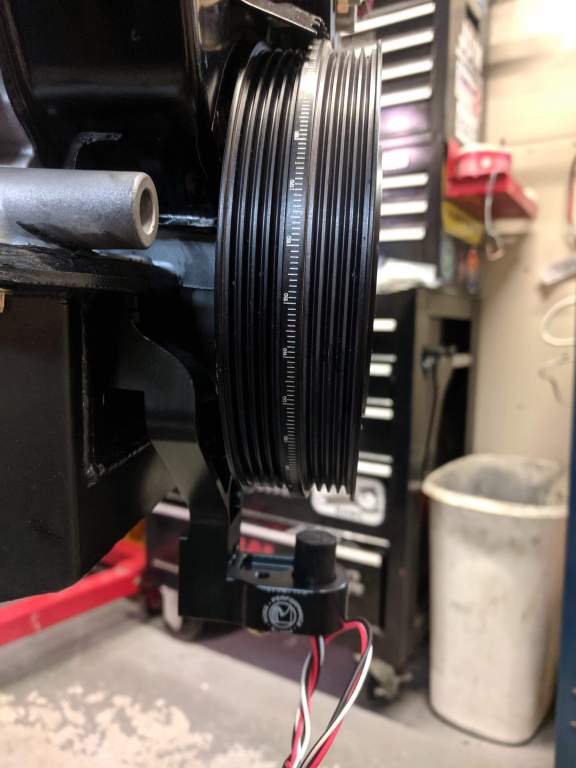 This is the Hall effect sensor and mount that came with the Ross Performance kit. Obviously, it doesn’t have a ring to match up to and it’s in a different position to where the new ring will sit. The plan is for the new ring to sit at the front of the dampener behind the PS pulley and then spaced correctly to suit. The whole crank pulley will then be realigned to correct the offset with the PS pump [ATTACH=CONFIG]118170[/ATTACH]