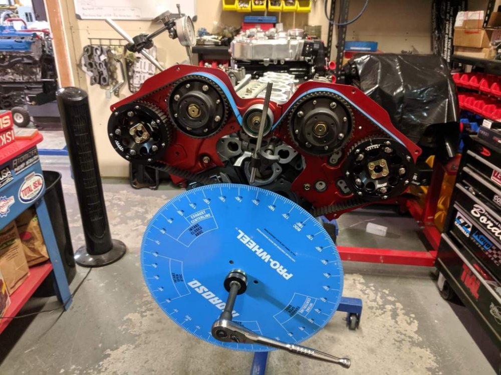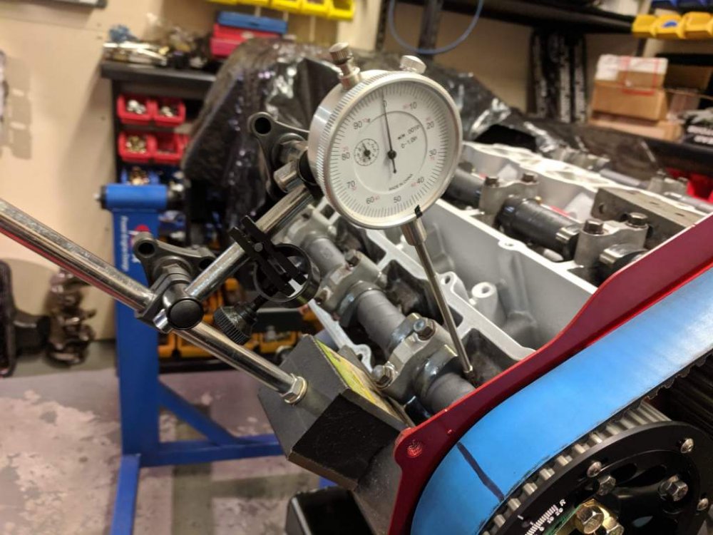 Getting closer. With the change of camshaft it’s paramount that they’re properly dialled in to ensure valve opening, closing and overlap happen when they’re supposed to. Furthermore, as my heads have clearly been skimmed, it’s equally important to make the appropriate adjustments are made to reset the centre line of the camshafts to crank. The adjustable cam pulleys make this possible and are a must when changing camshafts To make use of a large timing wheel (which makes the process easier and I’d guess more accurate) Mitch made up an adapter for the crank snout to enable the use of a bigger timing wheel Then the process began Hopefully this will be topped and tailed later today and the final bits and bobs will be installed ready for shipping