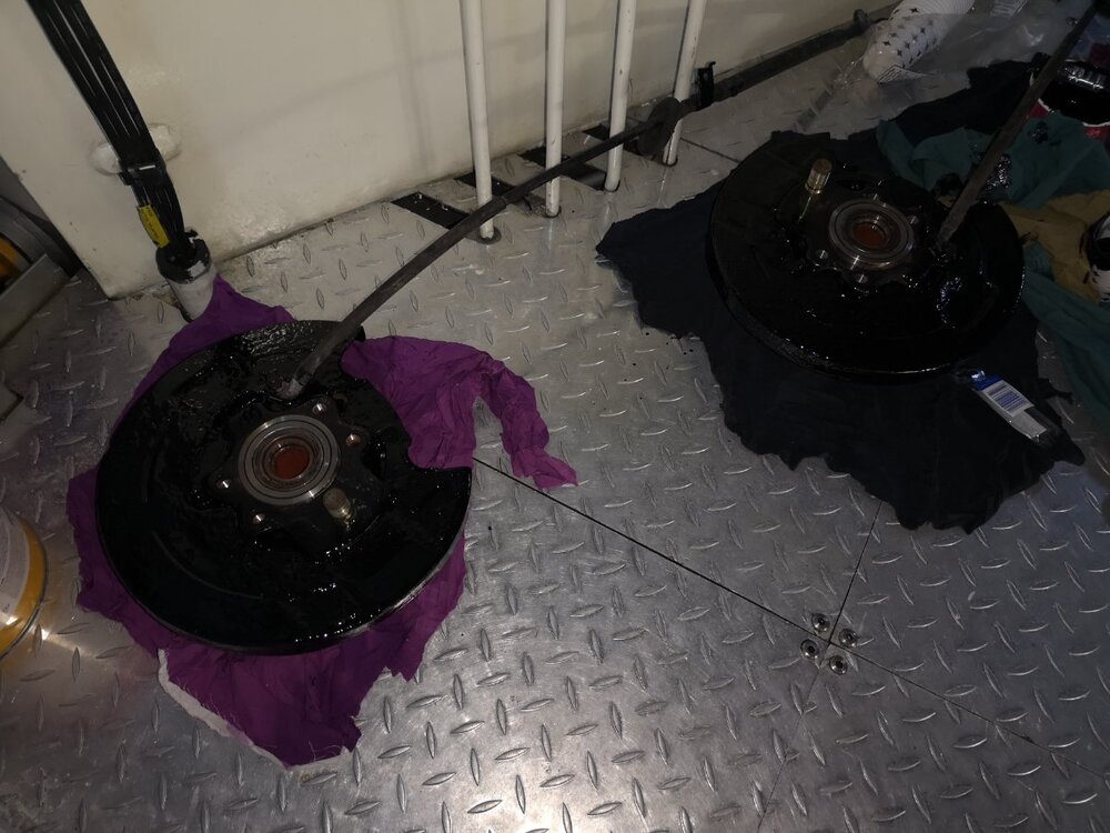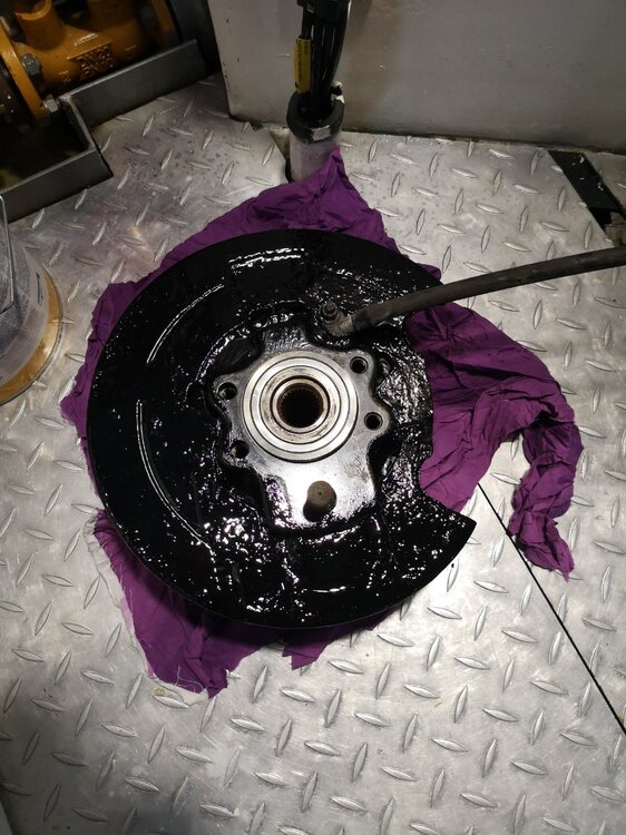 My sea survival refresher didn't take as long as expected today, so I managed to get some paint onto the hubs tonight (note it's still wet in that pic. Will dry to a satin finish). I'm pleased I finally got these done as they took absolutely ages to clean off the heap of crappy underseal that someone had got all over them when they did the rear end and didn't mask anything.