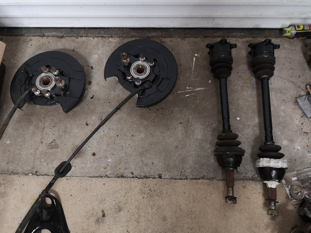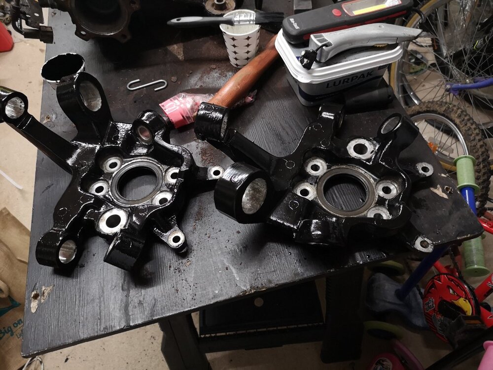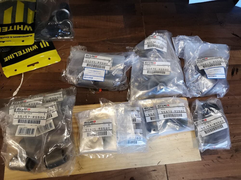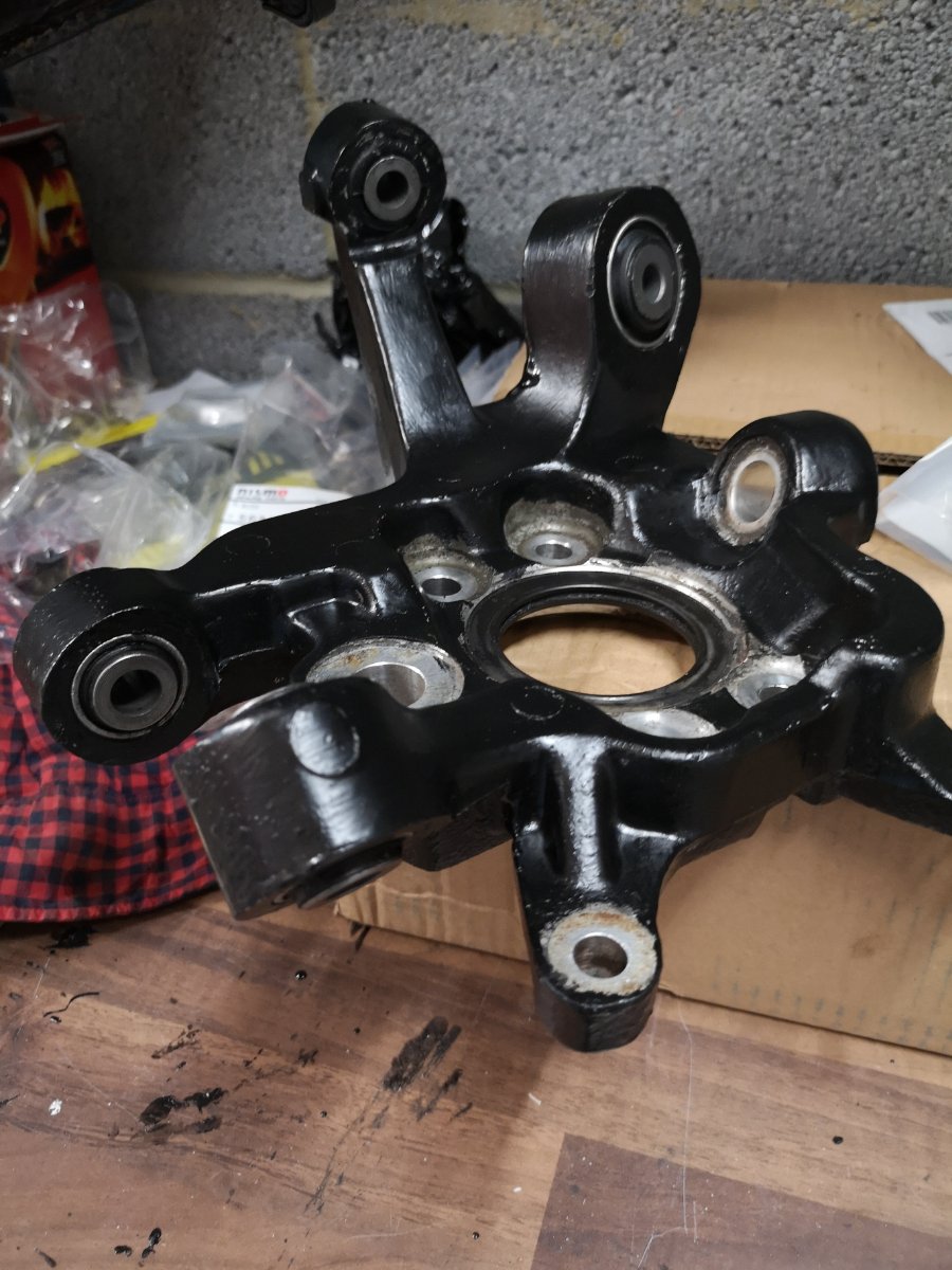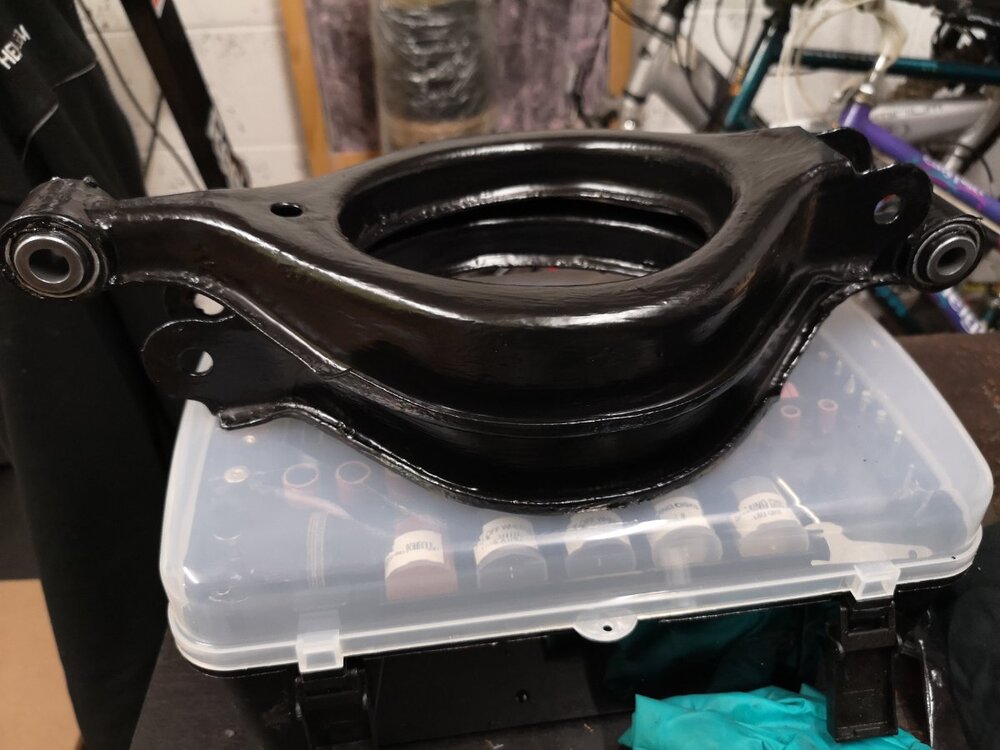 Little bit more progress made past couple of days. Progress much slower than hoped as we've been busy at work the past few weeks. All these bits have now had the 2 coats of Jotamastic 87. They'll get 2 coats of Jotun Hardtop at the weekend. Still got a few stubborn bushes to remove from the suspension arms, but that should be sorted today and hopefully get at least 1 coat of primer on to all the arms over the weekend. Apologies for the shockingly poor photos. Mix of Nismo and whiteline bushes are all waiting for me at home. Along with new Moog ball joints for the rear end.
