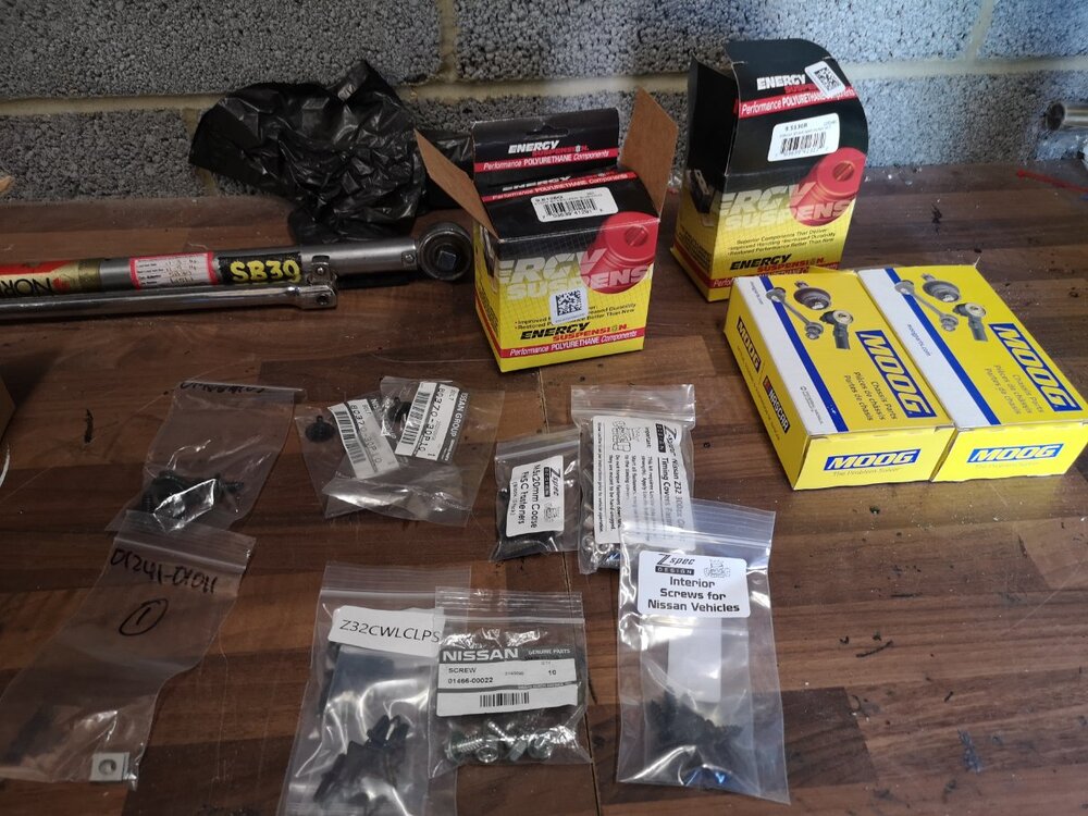 Some new bits have arrived. Front adjustable bushes for the OEM fucas that I've overhauled to replace the cheap Midori style ones that came with the car. New wheel nuts to replace the fecked chrome plates ones that don't seat properly on the alloys. Got home from the boat today. Now got 2 weeks to get the front end sorted and a few other niggles done before she heads down for metal work and some paint.