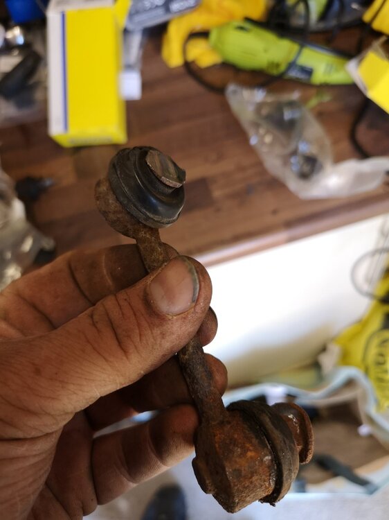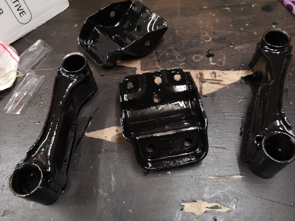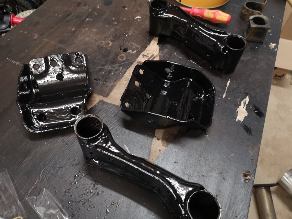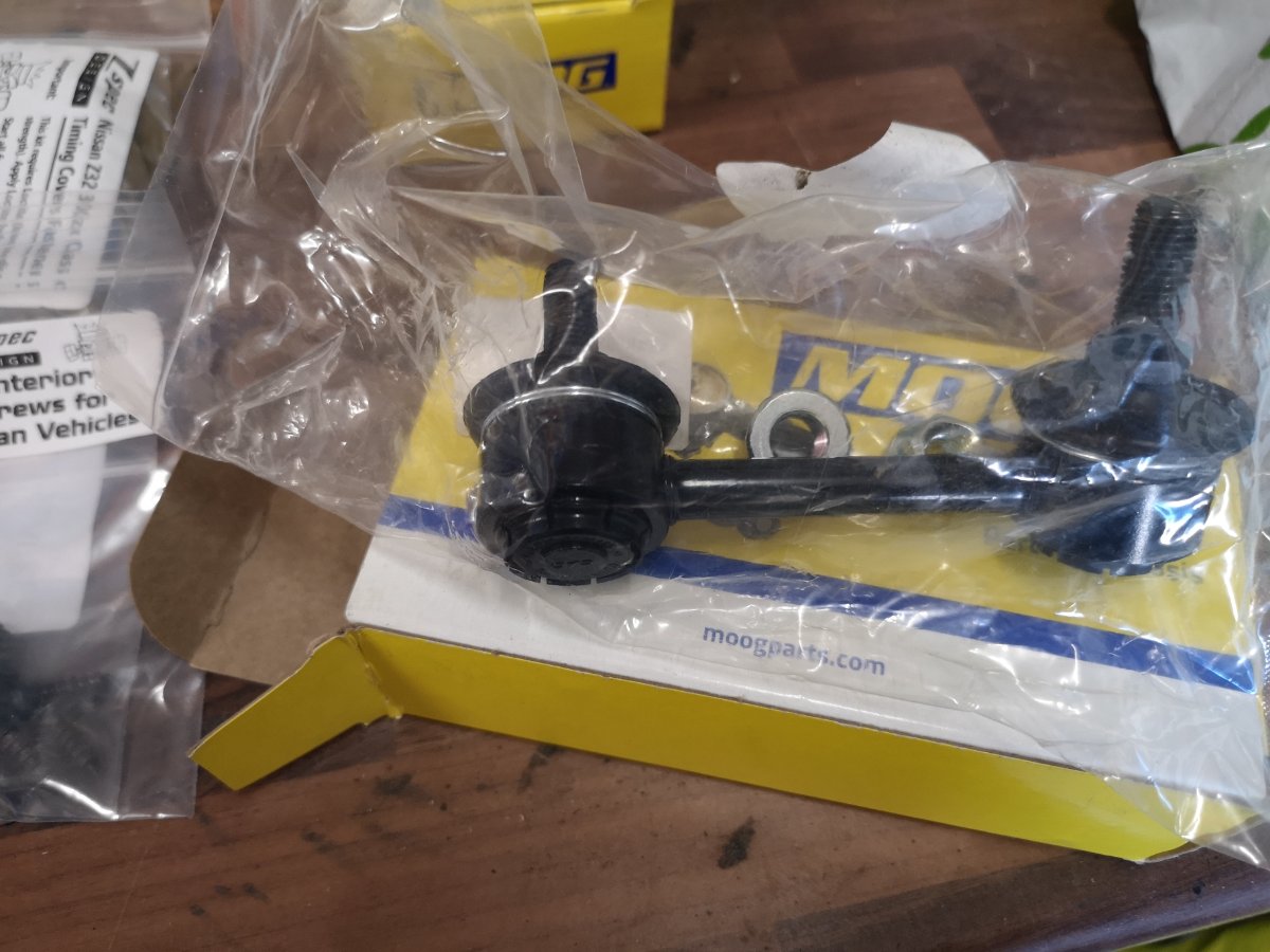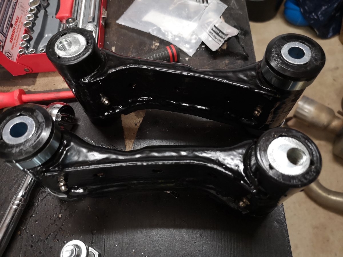 Been busy today. I gave up with the exhaust bolts. I'll let the garage that's doing my new sills drill them out. Instead I made a start on the front end regarding the bits raised in the last MOT. Needed the angry spanner to get the knackered drop links off, but at least I managed not to damage my eye this time. Unknown brand crappy adjustable FUCAs removed. Finished painting up my spare set of OEM upper arms, and will install the Whiteline adjustable bushes in tomorrow and refit to the car. New Moog drop links in. And I've cleaned and painted the front ARB and have new bushes and brackets ready to go on with it. Weirdly this is a 28mm ARB so either a previous owner uprated it, or Nissan gave up on the crappy thin ones that usually came with NAs by time they got round to the 99 specs.
