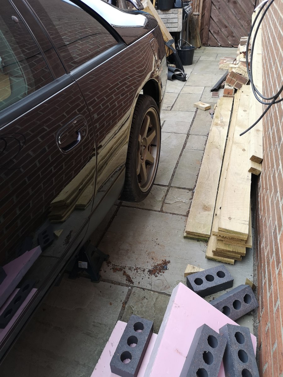 The wheels are on! Back end is now back on the ground. Left the exhaust off for now. Ideally need to remove the drivers downpipe to sort a snapped stud.