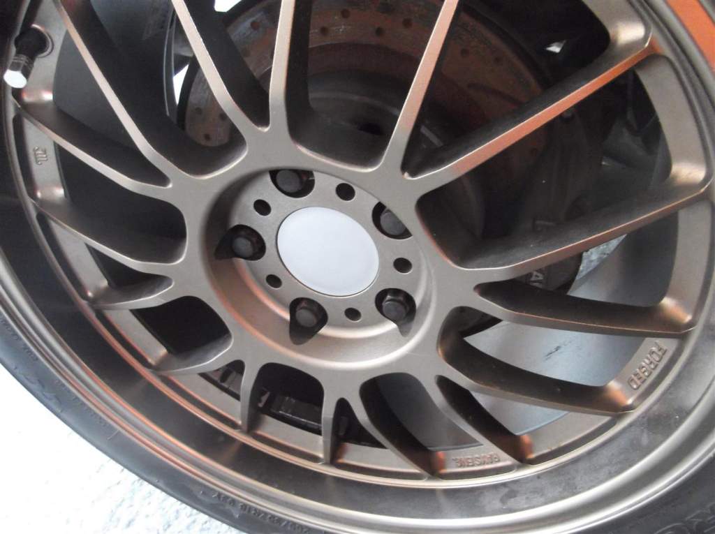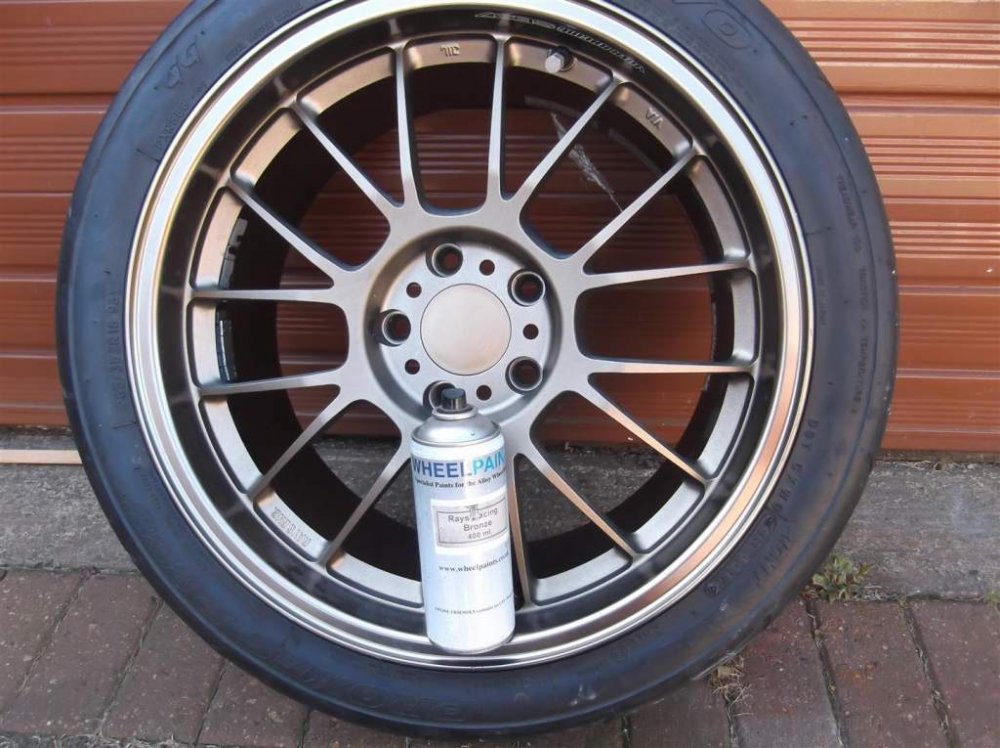 Wheel centres...round two............................................ I have been to my local paint factor and he has mixed me a tin of Fiat Marrone Volcanico. We also looked at a lot of other colour chips. It seems to us that the Fiat colur is as good as it gets. It is a bit too dark if sprayed normally so I have used a silver base coat and then misted the marrone on top, stopping to check after each coat. Im satisfied with the final look . The misting technique gives a coarser finish which is close to the raw anodized alloy. Just got to do three more to match now!