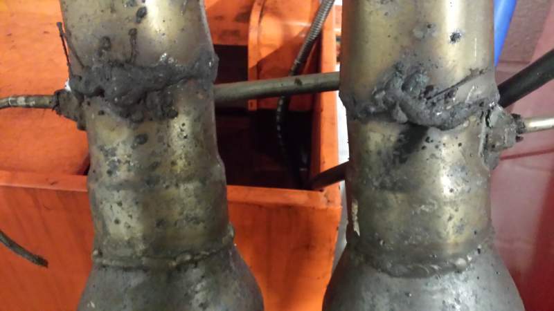 while at Jimmers the old Exhaust ( apparently custom made by a well respected ex trader on heres expert friend ) and at a considerable amount of money i may add had to come off ...well this is what he found, to say i was shocked is an understatement i have sat on these for some months now pondering if i should post them or not ..anyway let you all be the judge ....
